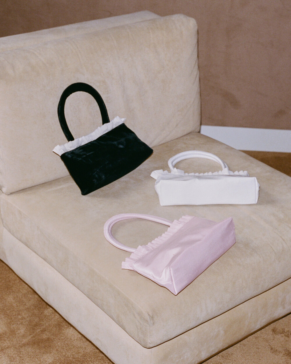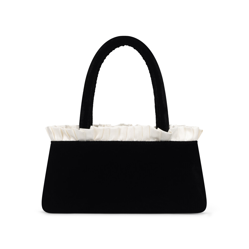직사각형 셰잎의 바디에 듀퐁 실크로 제작된 프릴로 사랑스러움을 더한 Estelle Bag 입니다.
