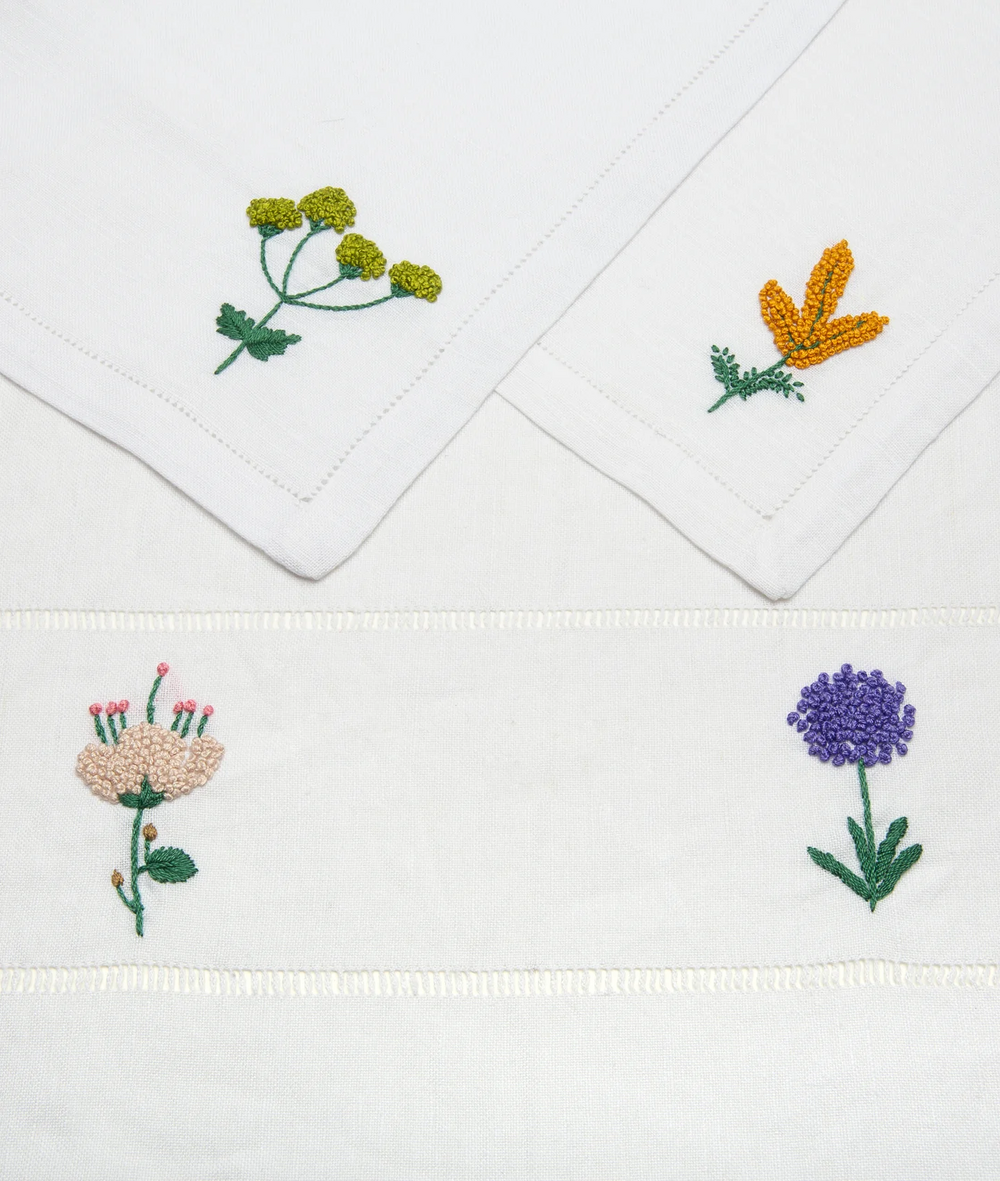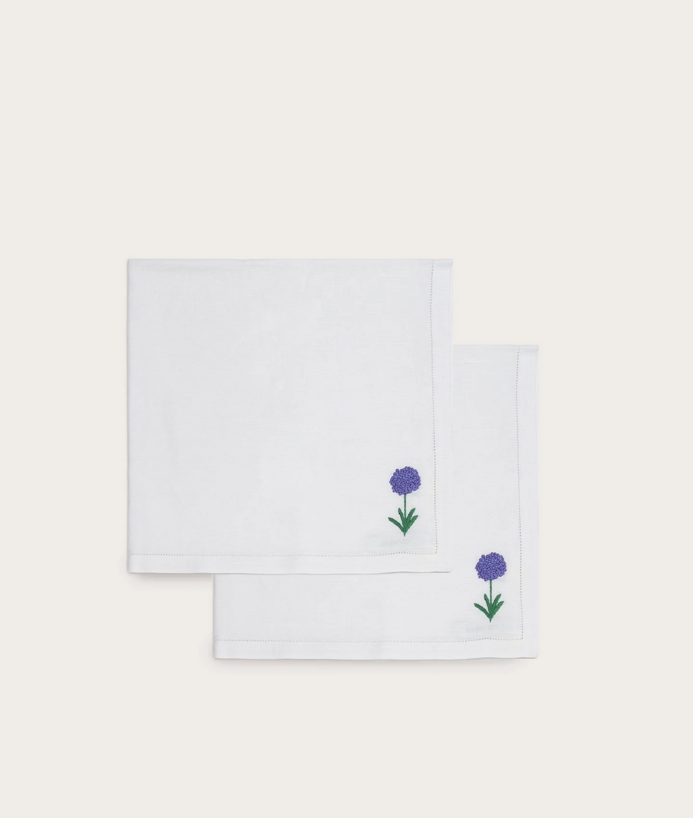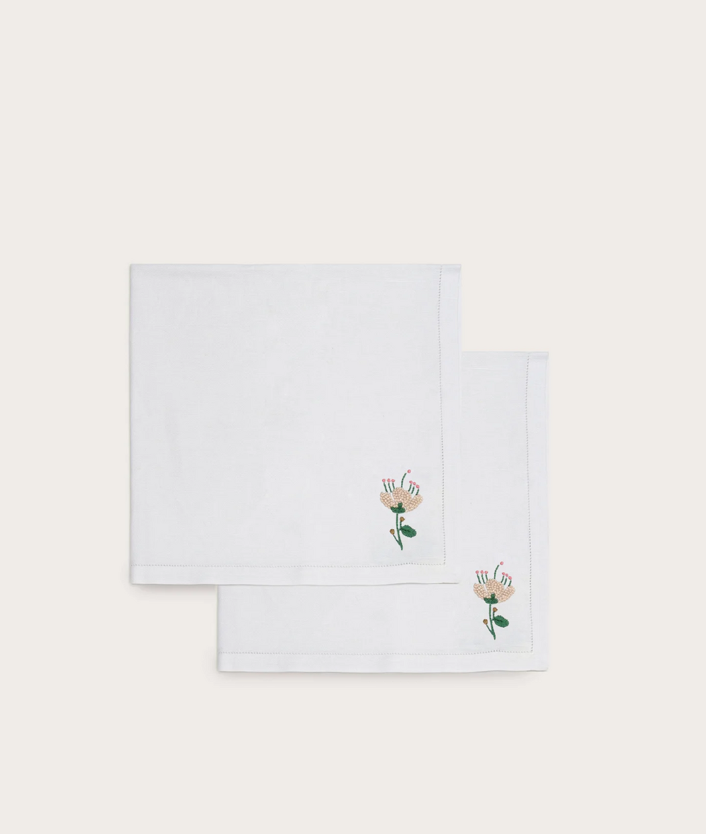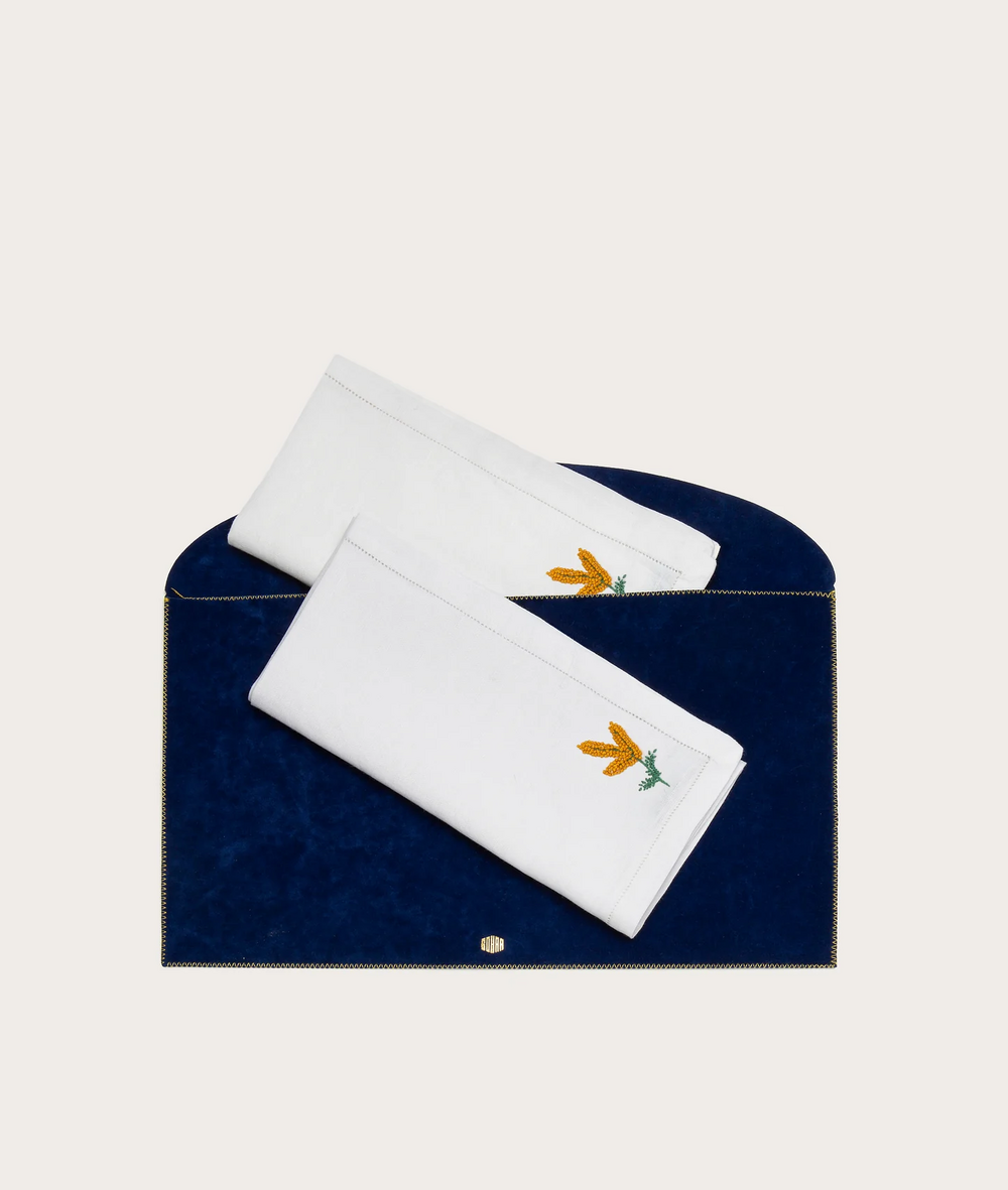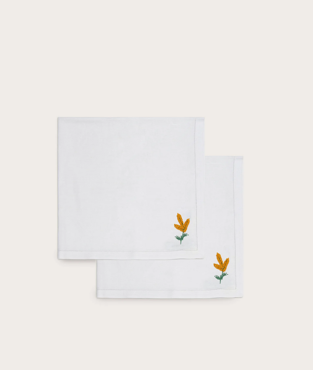 A Jour & Flora 자수 식탁보 와 완벽하게 어울리는 이 제품은 케이퍼, 양파, 회향, 미모사 색상의 냅킨 한 쌍으로 출시됩니다.