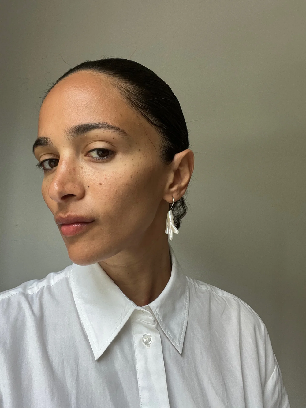 닭발 모양의 프레시워터 진주가 클래식한 스털링 실버 후프에 우아하면서도 초현실적인 매력을 더해줍니다.