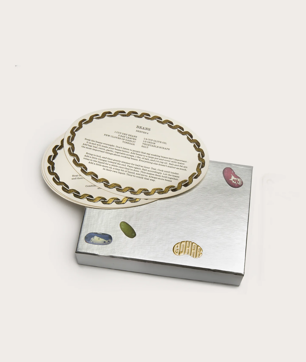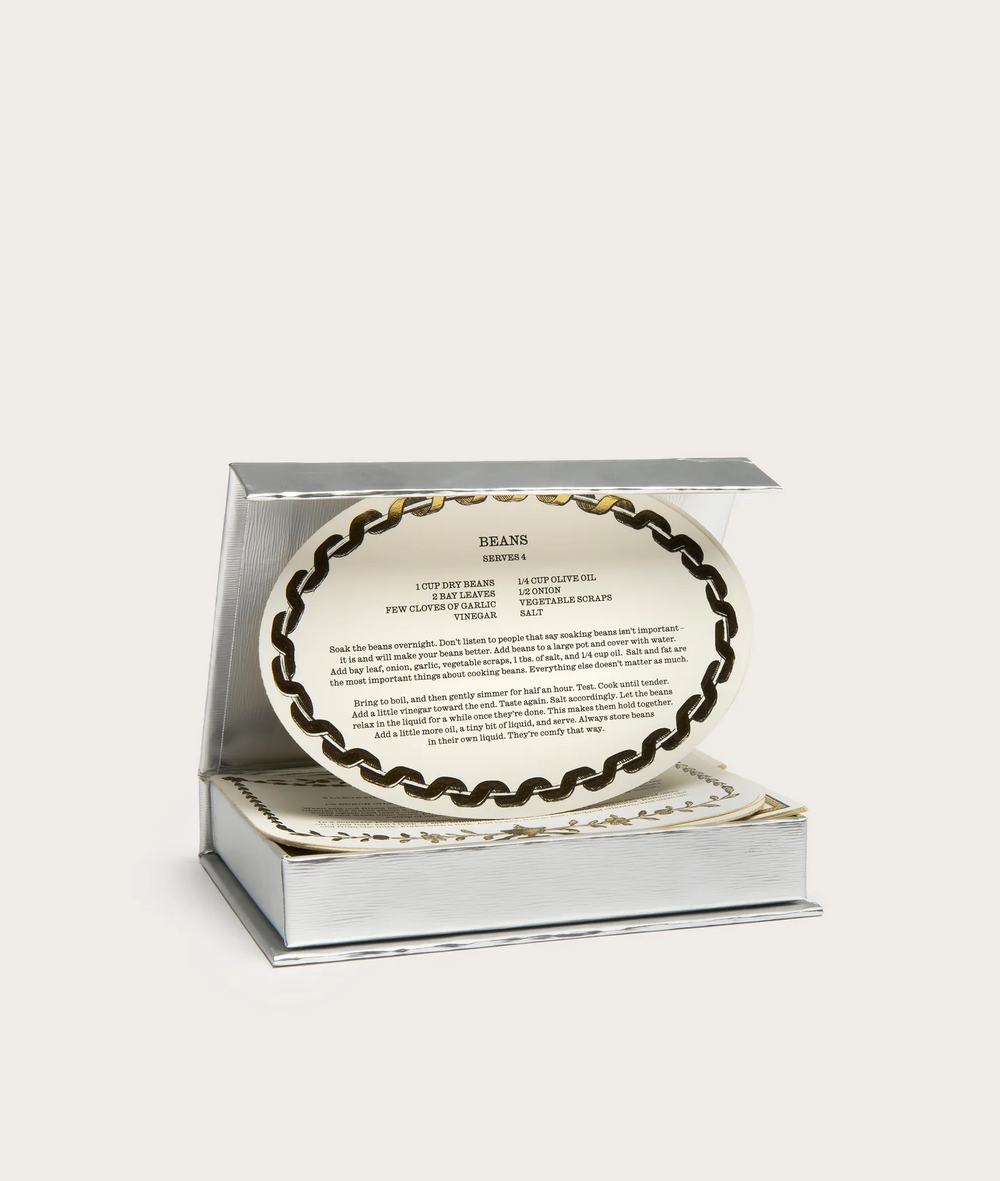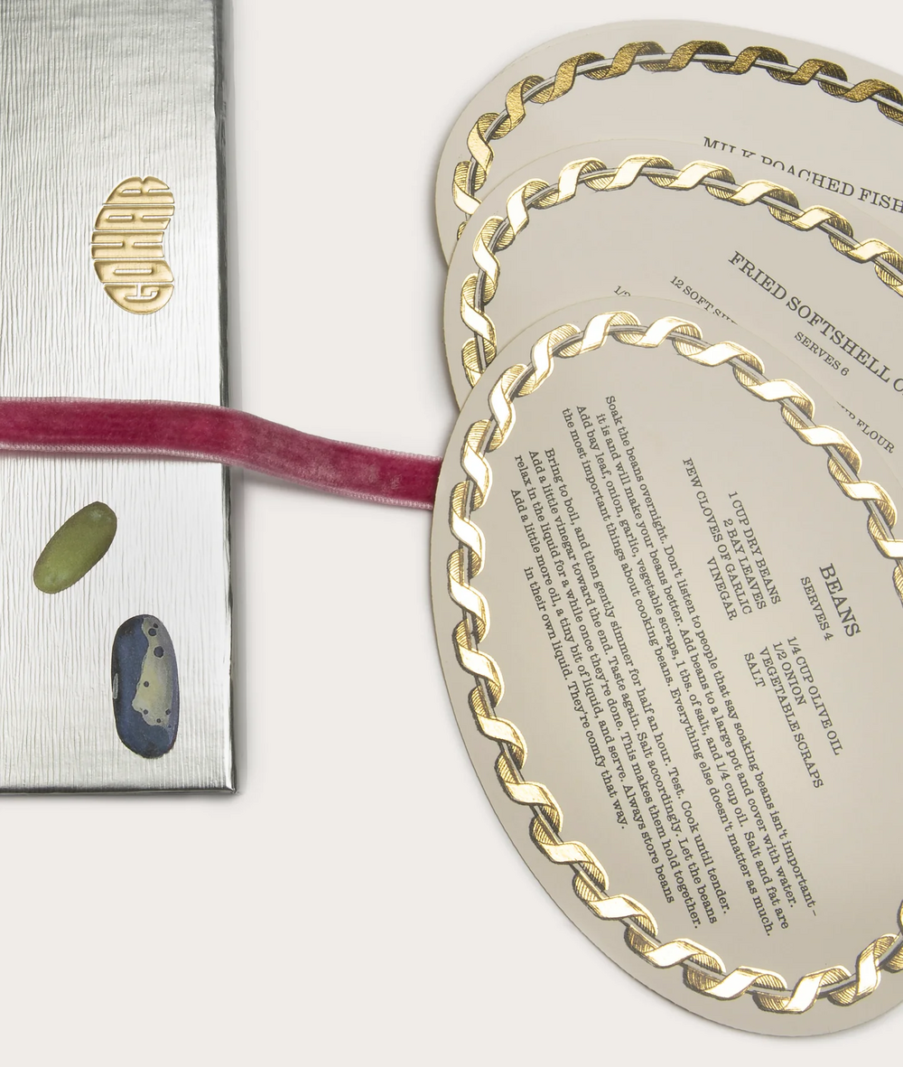 레시피 카드는 콩 스티커와 벨벳 리본으로 장식된 은색 상자에 담겨 선물용으로 좋은 제품입니다.