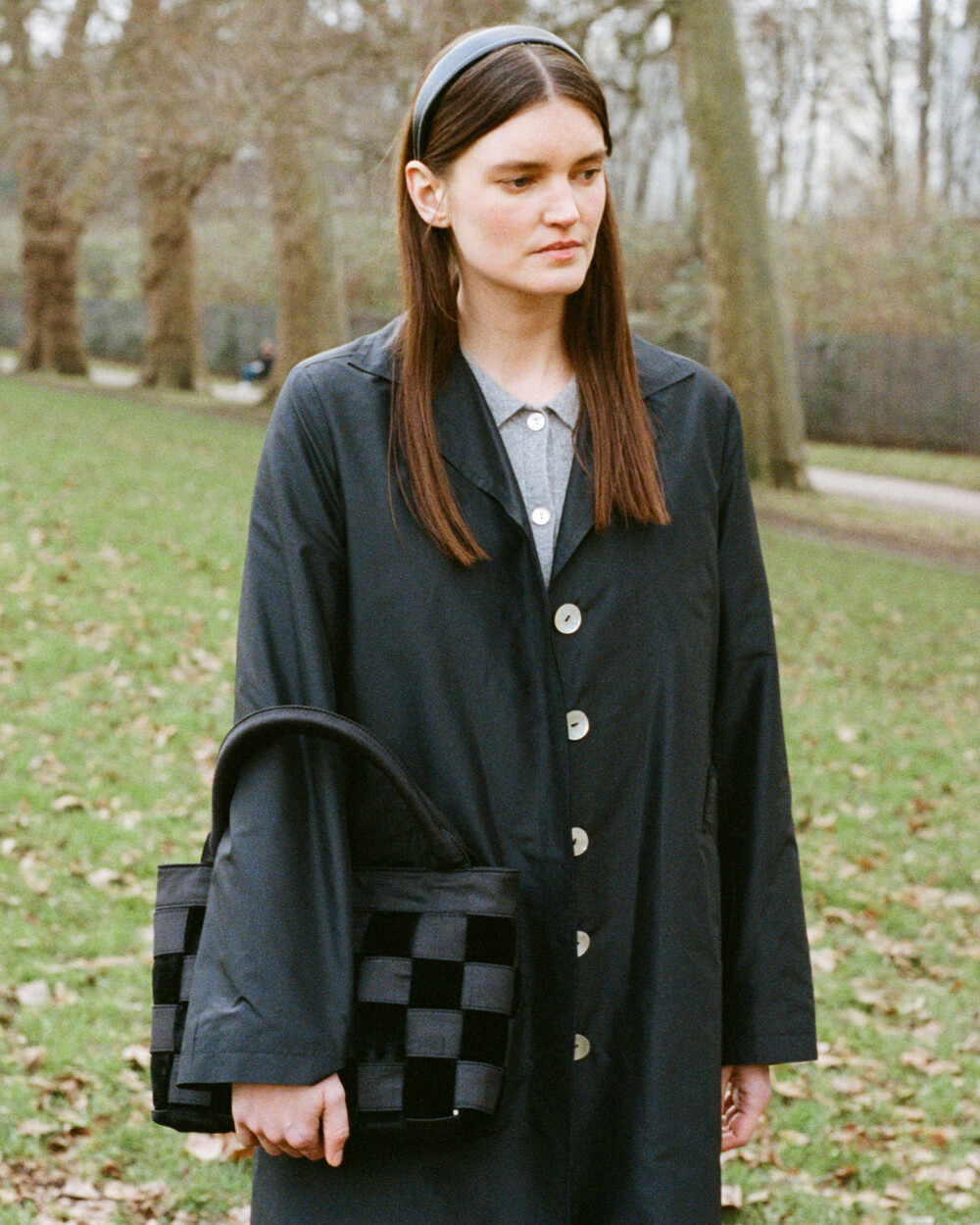 조직감이 살아있는 듀퐁 실크와 부드러운 벨벳을 체크 패턴으로 교차하여 유니크한 표면을 완성하였습니다.