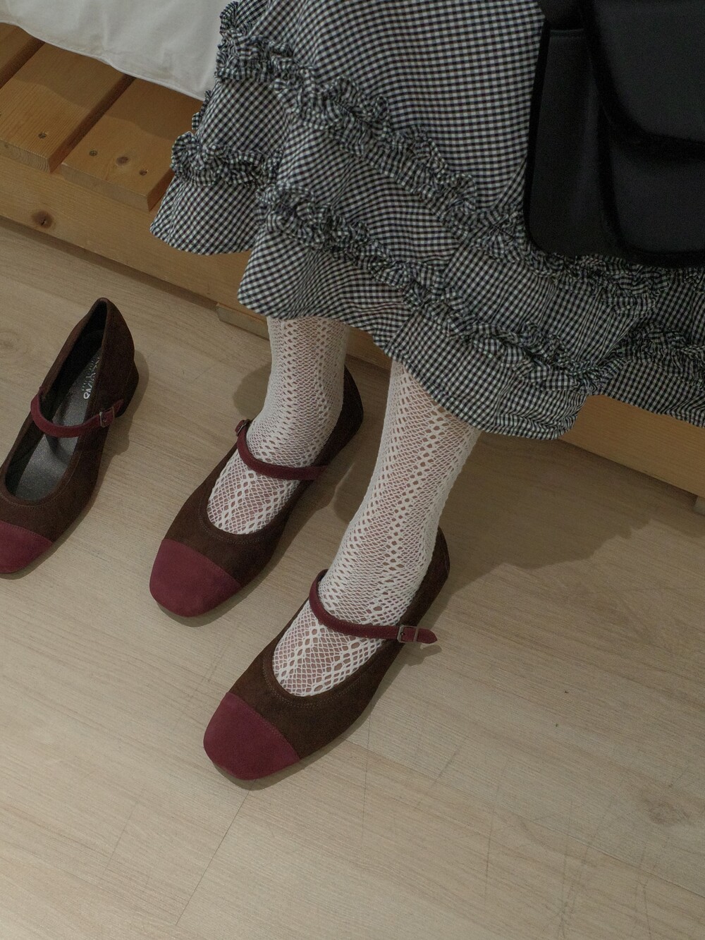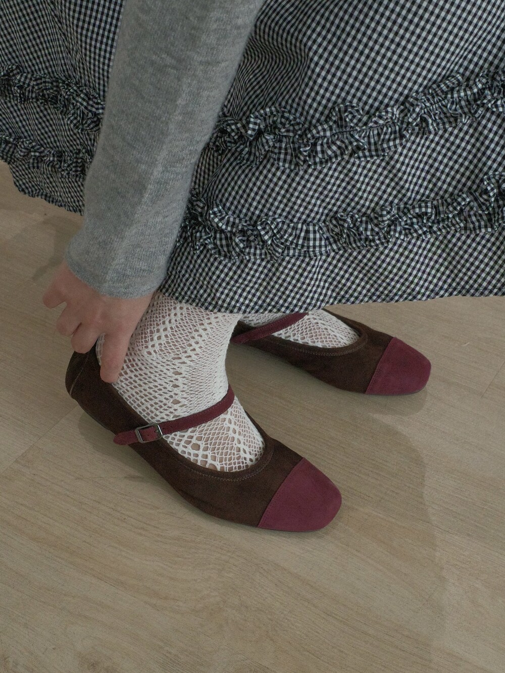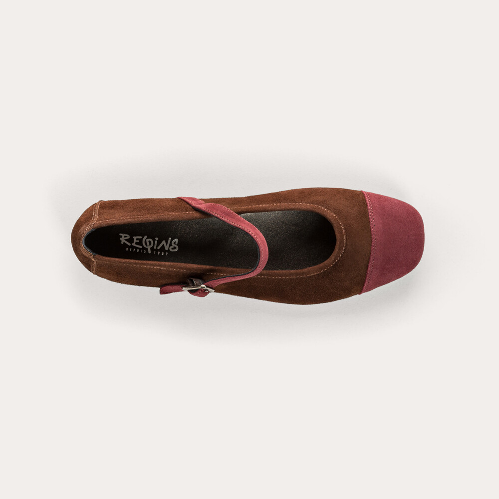 발끝을 감싸는 말린 장미빛의 톤다운된 보르도 컬러 배색이 포인트를 더합니다.