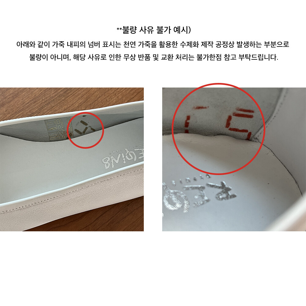 * 사진에서 보이는 끈 부분에 있는 자국들은 가죽 마감 공정 상 발생할 수 있으며, 이는 불량이 아닙니다. 따라서 해당 사유로 교환 및 환불은 불가합니다.