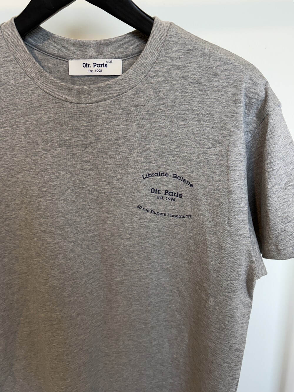 앞면에는 오에프알 파리의 시그니처 로고, 뒷면에는 푸른 배경 위 말 그래픽이 담긴 티셔츠입니다.