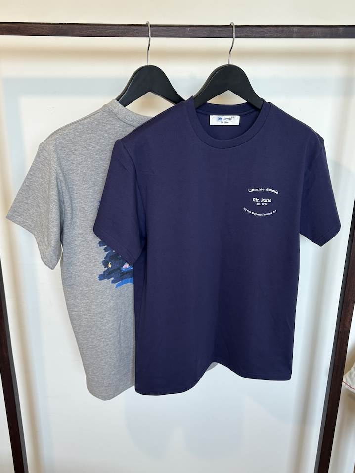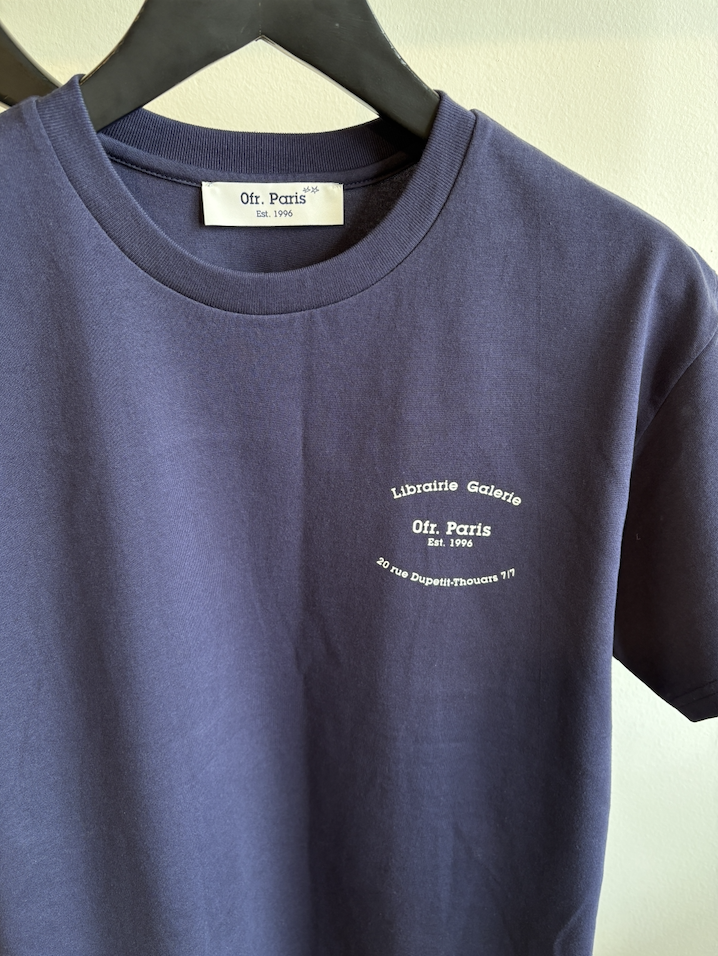 앞면에는 오에프알 파리의 시그니처 로고, 뒷면에는 푸른 배경 위 말 그래픽이 담긴 티셔츠입니다.
