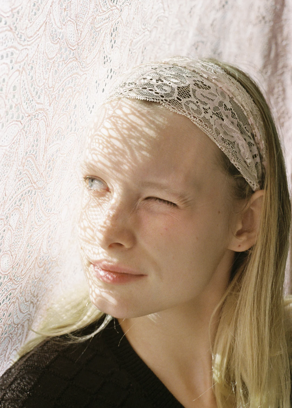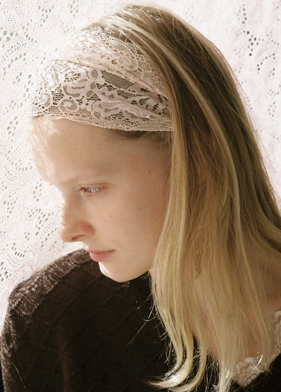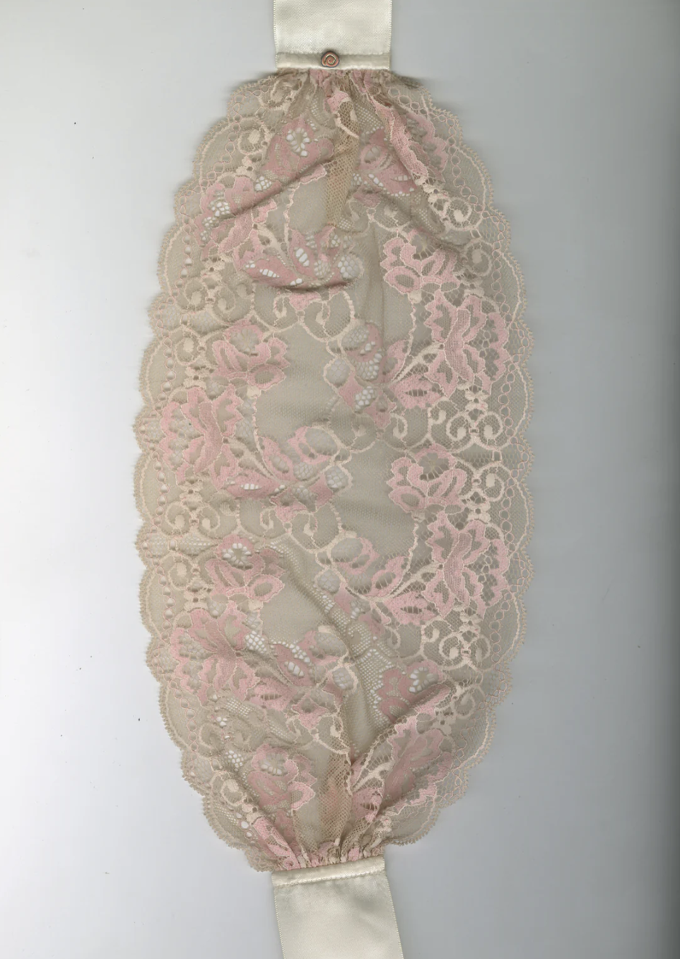 - Light Beige and Pink Bandeau in Stretch Lace, Gathered on Satin Ribbon
