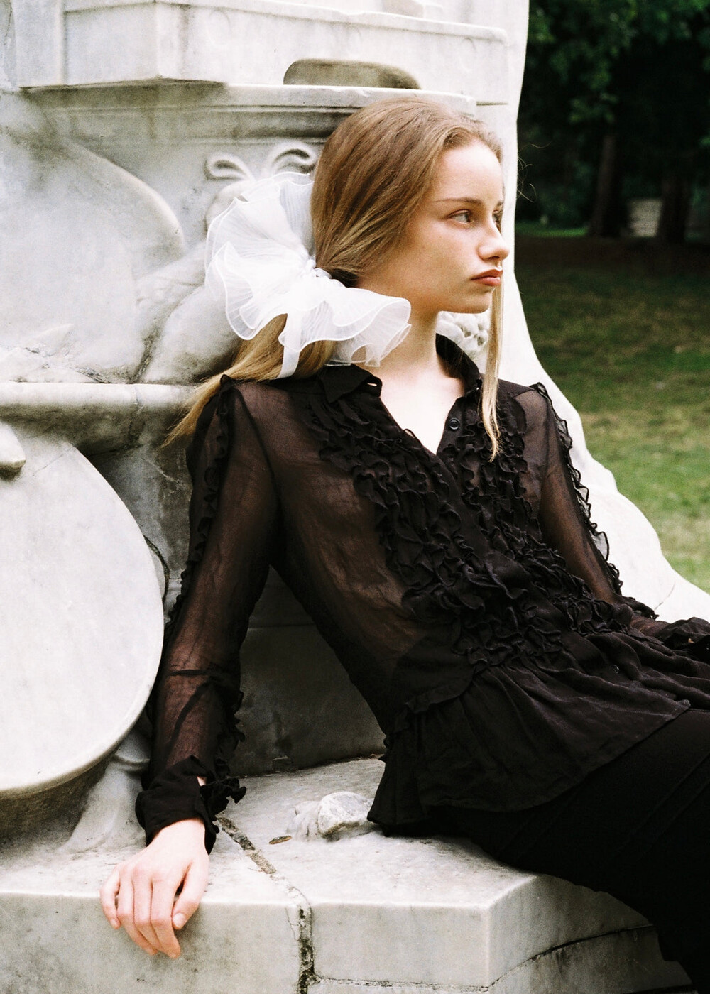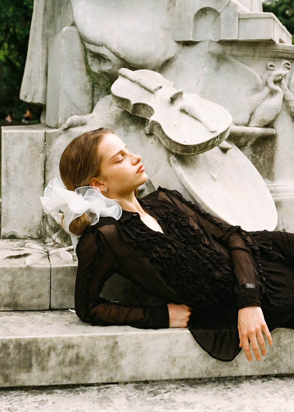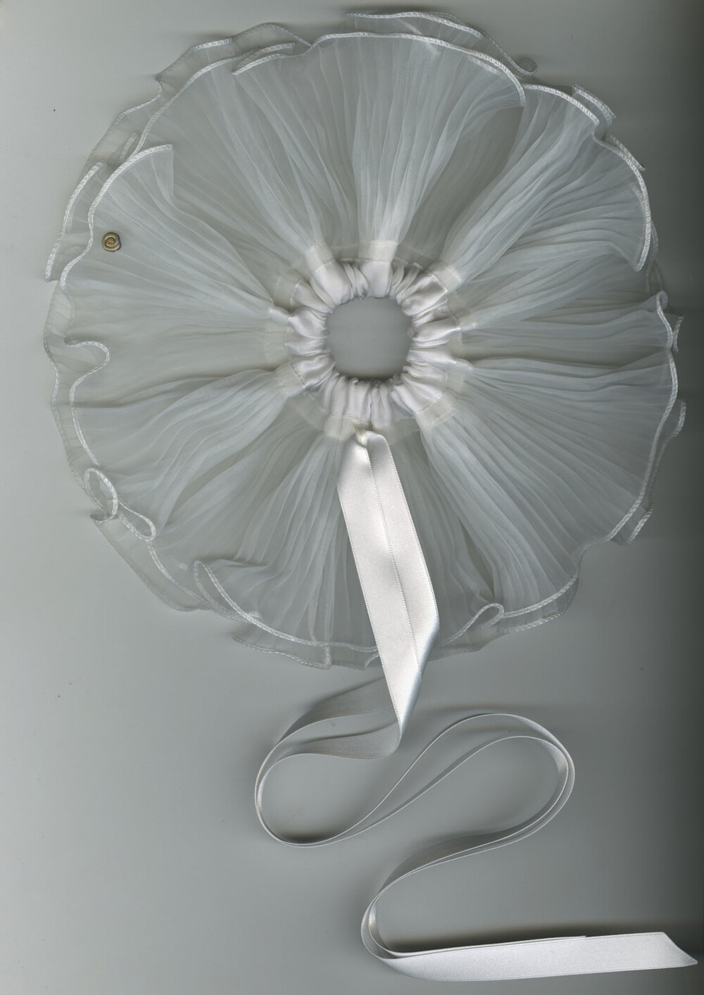 Details - 새틴 리본이 달린 흰색 주름진 오간자 스크런치 / 함께 또는 따로 착용할 수 있습니다.