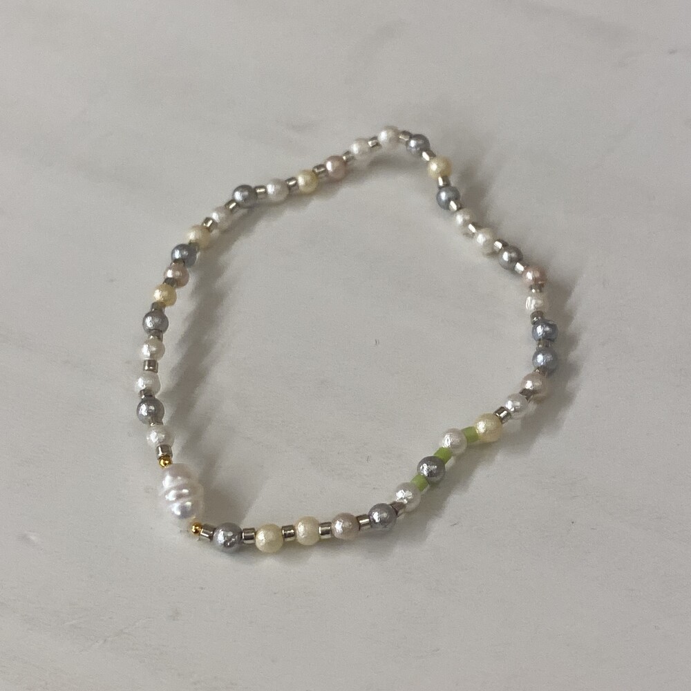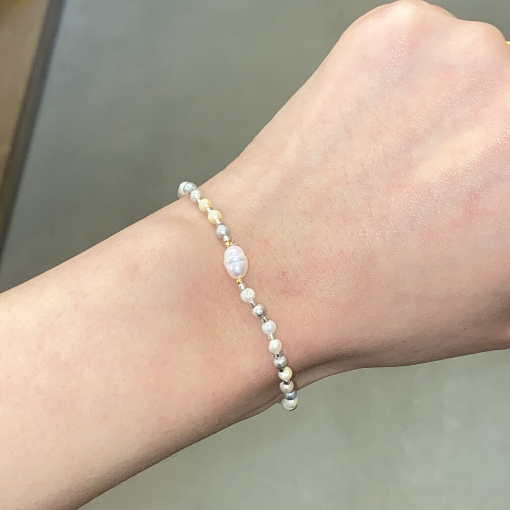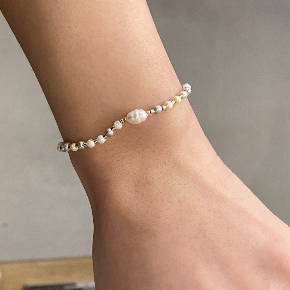 비즈와 진주가 서로 조화를 이루며 연결되어있는 형태로, 어느 룩에나 잘 어울릴 듯한 팔찌입니다.