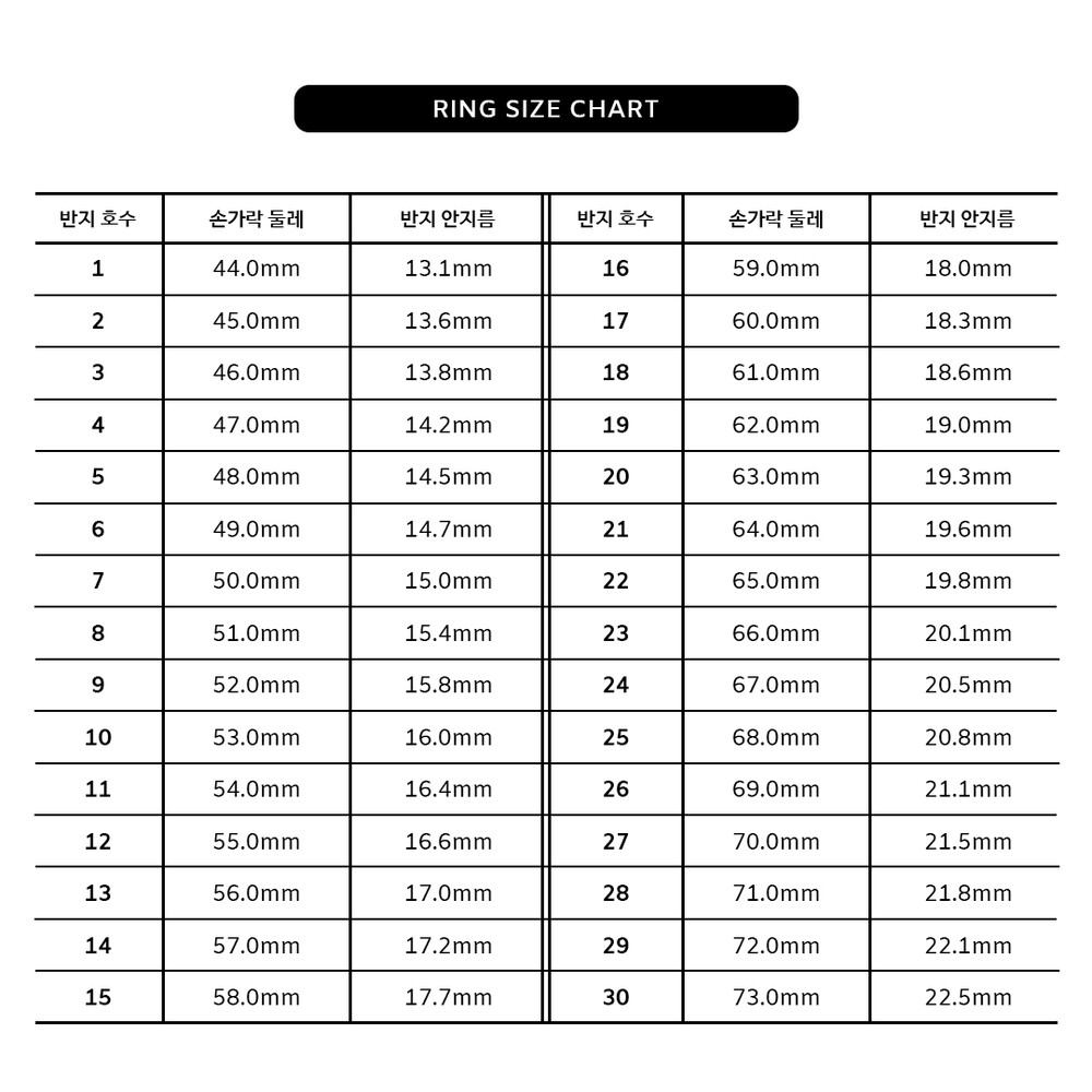 - 반지 제품의 경우 1호수 정도 사이즈 오차가 발생할 수 있습니다. 사이즈 미스로 인한 교환 및 반품 불가합니다.
