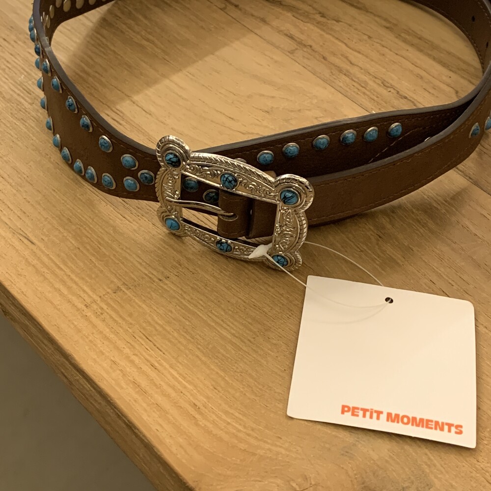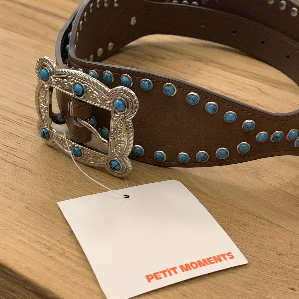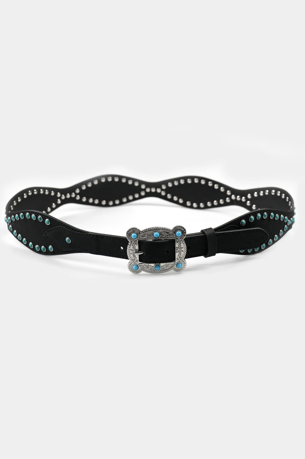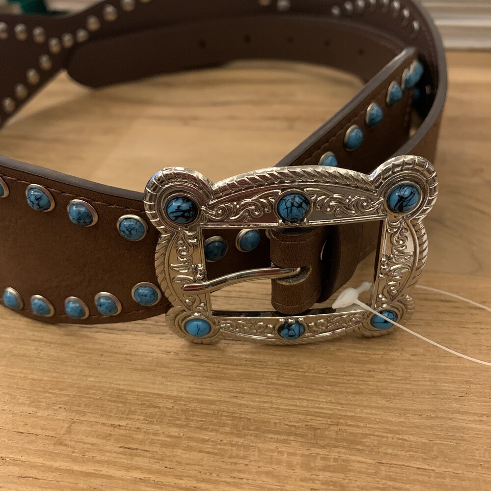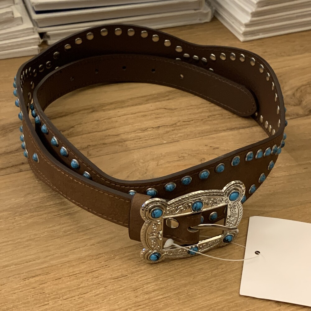 터키석 장식으로 꾸며진 웨스턴 스타일의 벨트입니다. 볼드한 옷차림에 포인트로 착용해보세요!