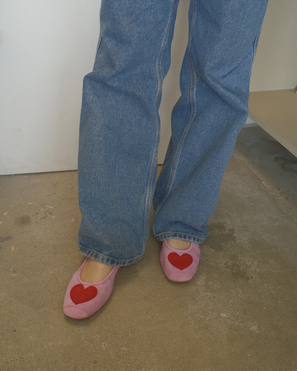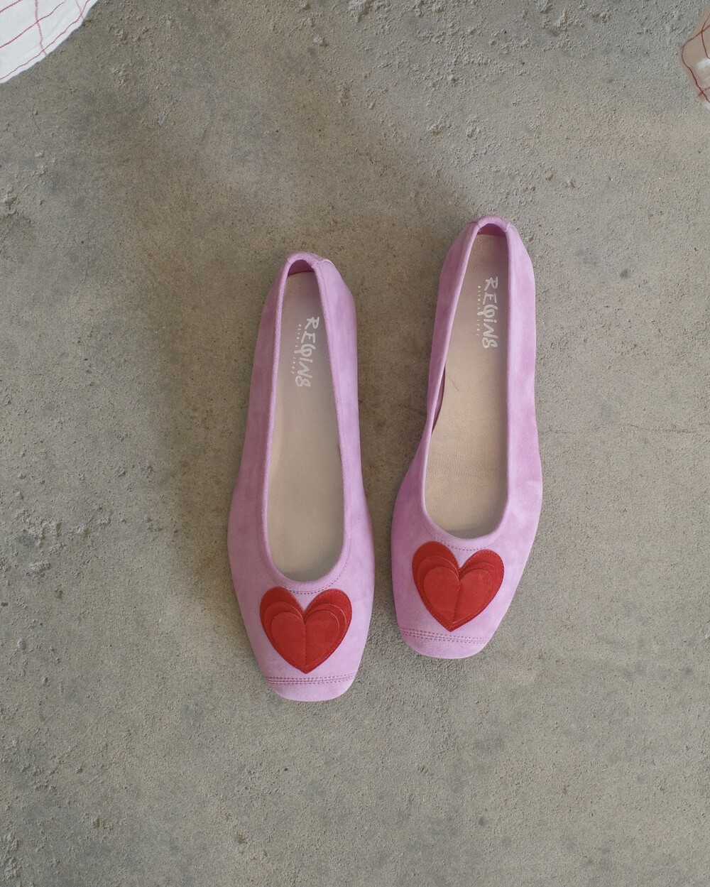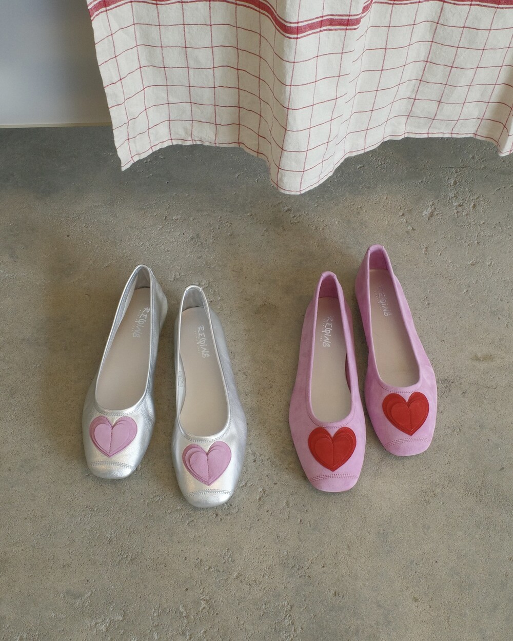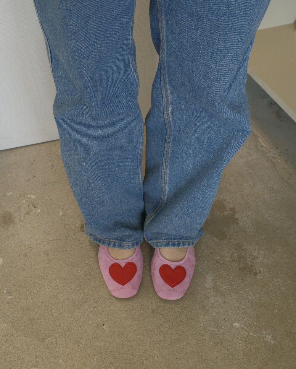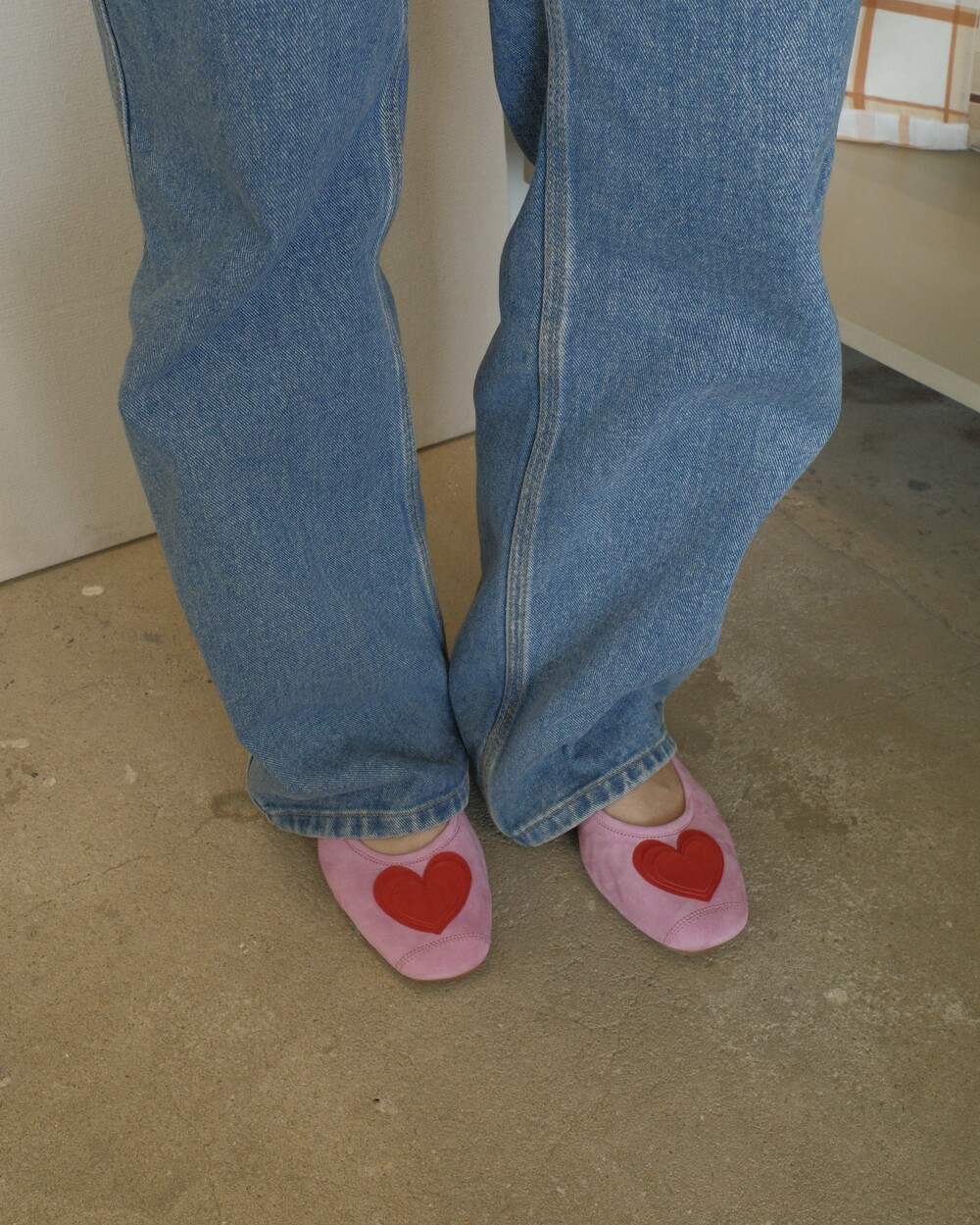 스웨이드 소재의 핑크 컬러 바탕에 레드 컬러의 하트 코르사쥬로 포인트를 준 Holove 모델입니다.