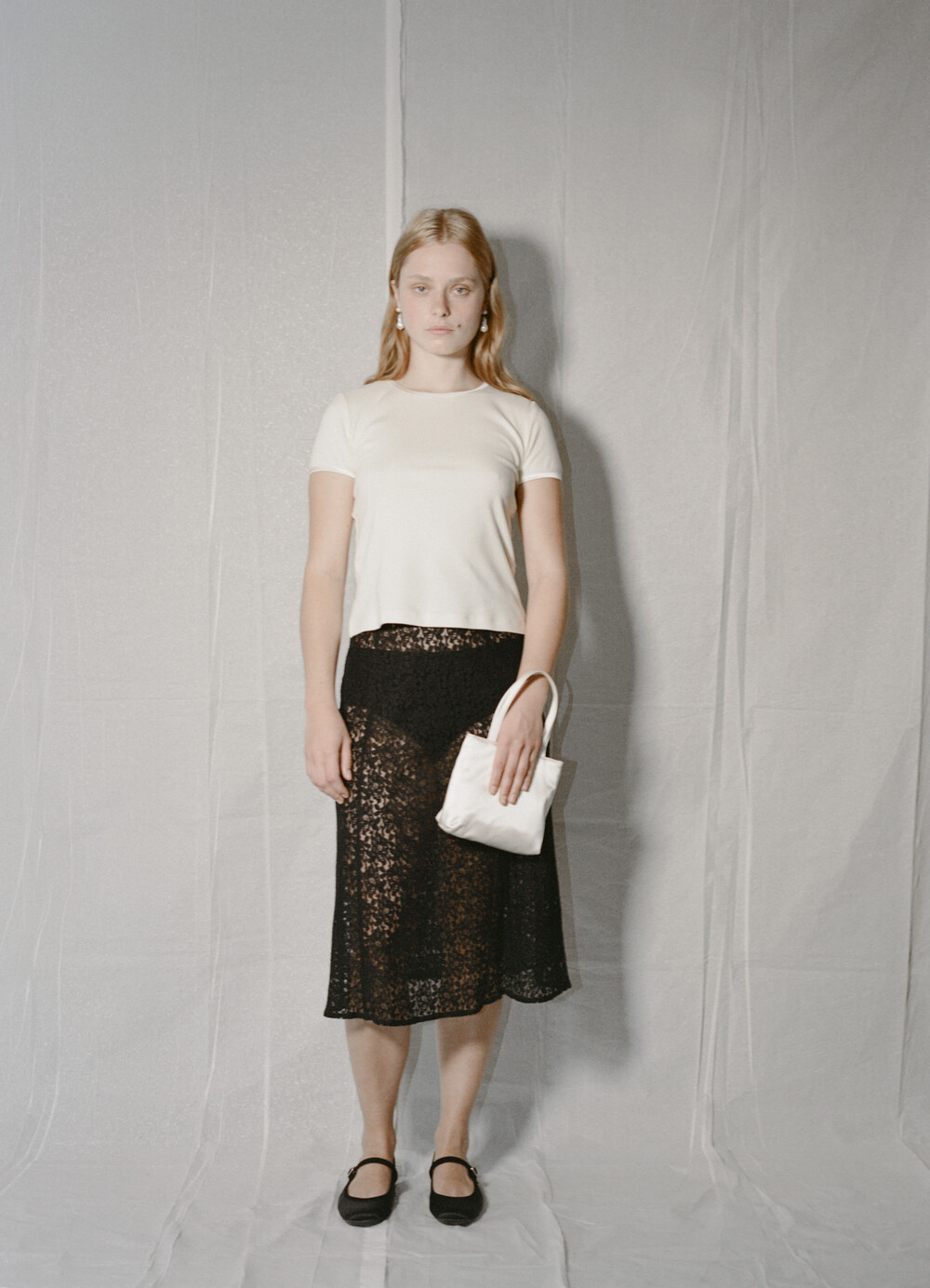 Talia Tee (Ivory) / Sofia Skirt / Little Silk Bag (Ivory) / Bell Earrings