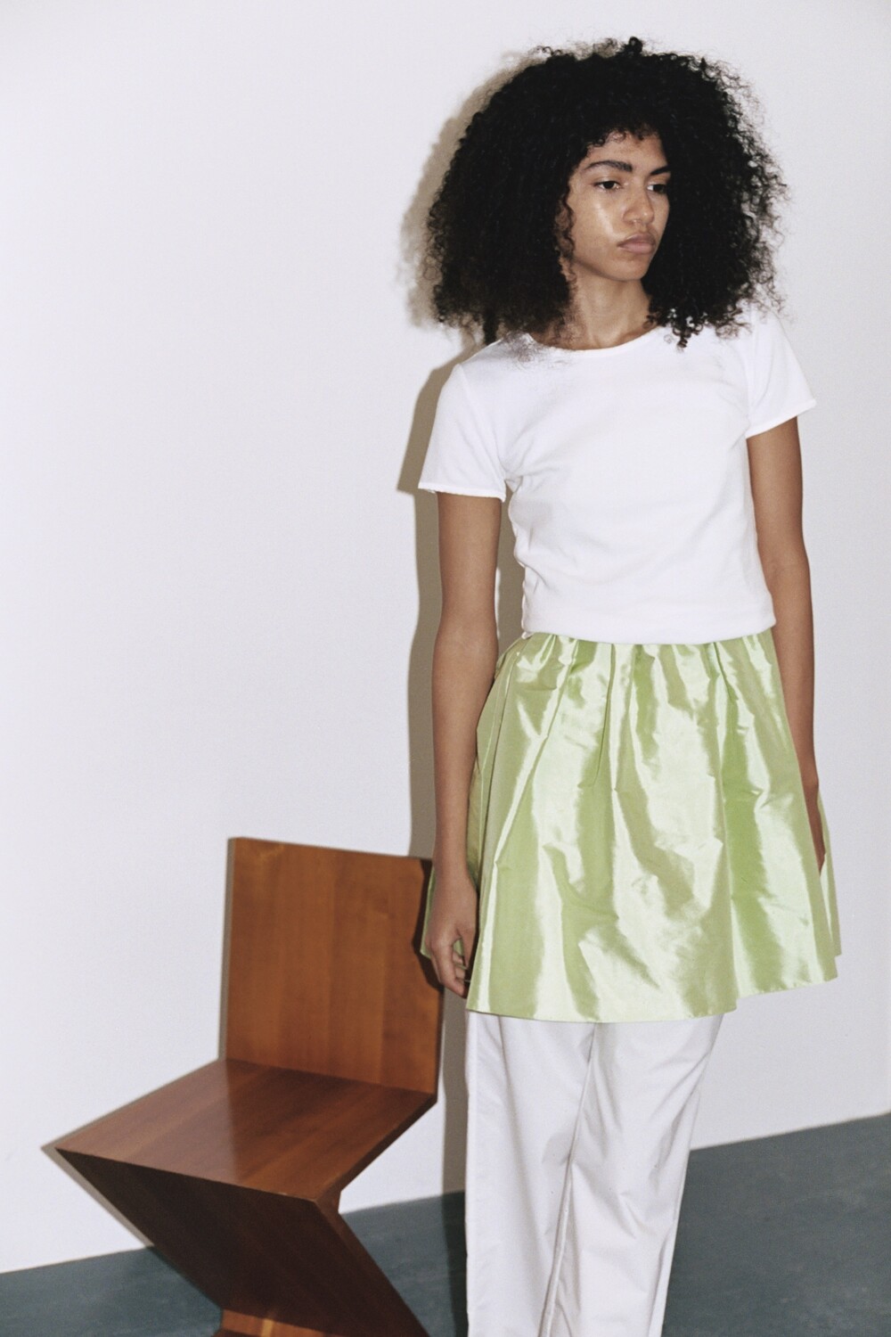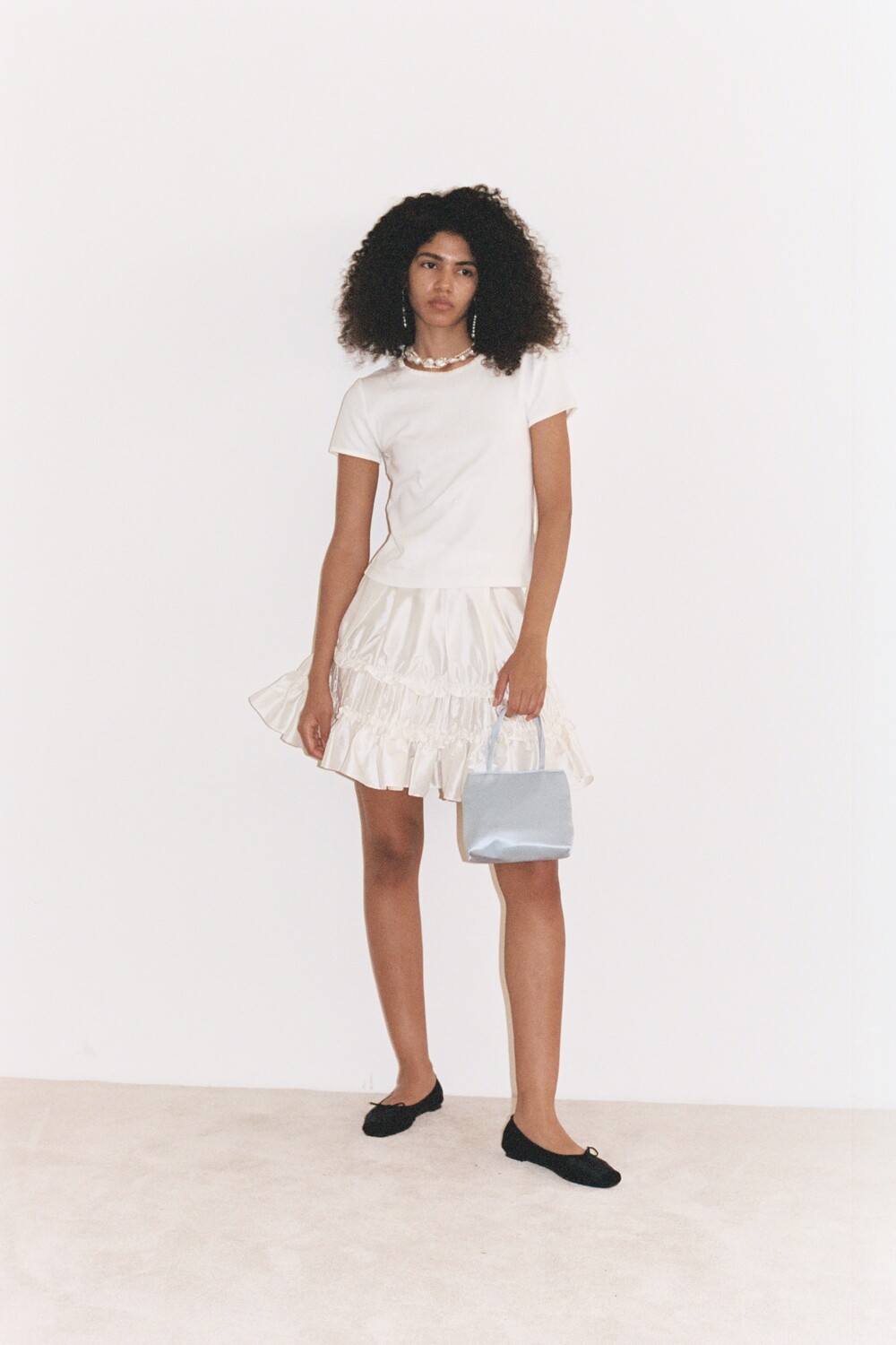Talia Tee (Ivory) / Mini Maud Skirt (Silk) / Little Silk Bag (Light Blue) / Hai X Reqins Ballerina (Noir)