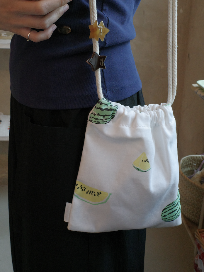 드로스트링 포셰트입니다. 스트링이 달려있어 간편하게 입구를 조여 사용할 수 있어 유용합니다. 크로스로 연출해 휴대폰, 지갑과 같이 필요한 물건만 챙겨다닐 수 있는 사이즈입니다. 가벼운 외출 시 활용할 수 있으며, 평소 활동 시 세컨백으로도 활용하기 좋습니다.