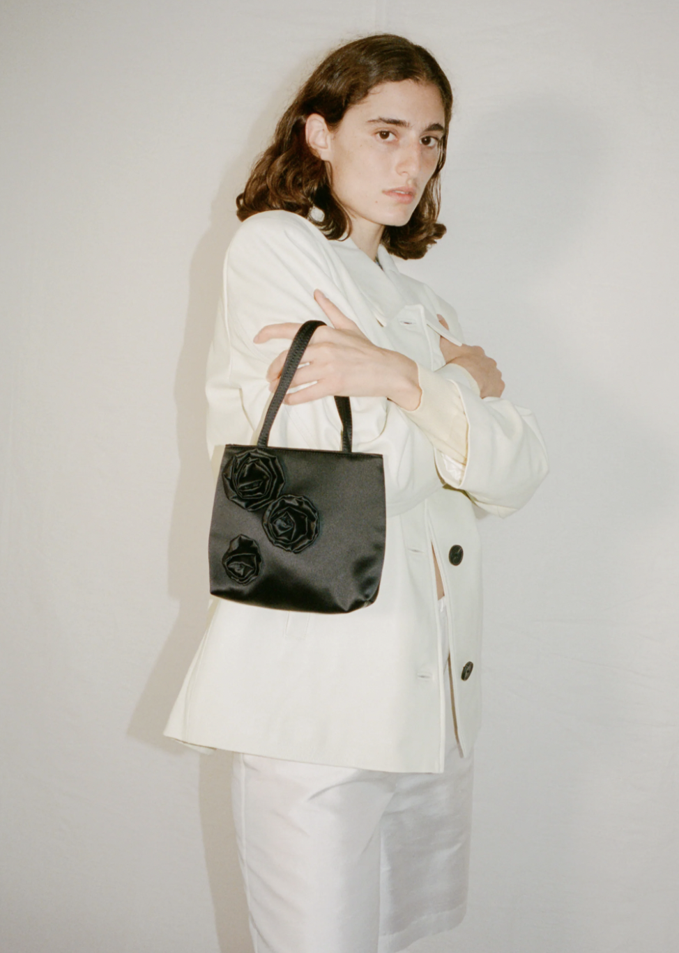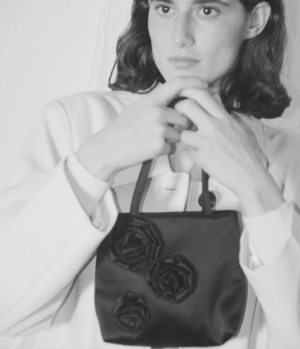 섬세한 플로럴 패턴과 다양한 크기의 로제트 장식이 특징인 Thea Bag을 소개합니다.