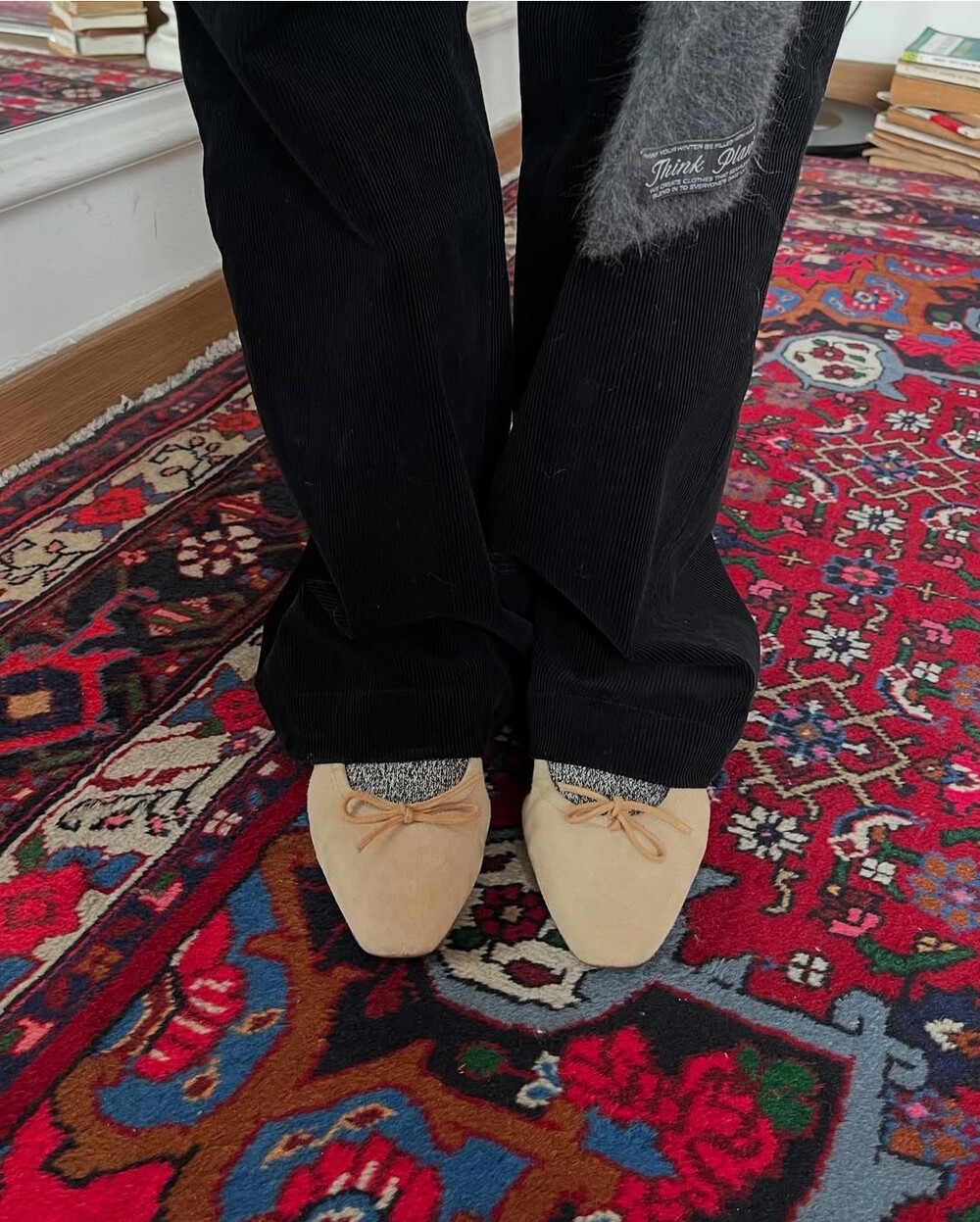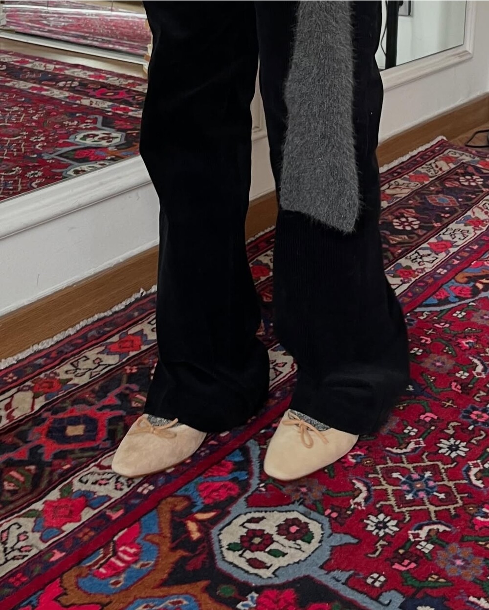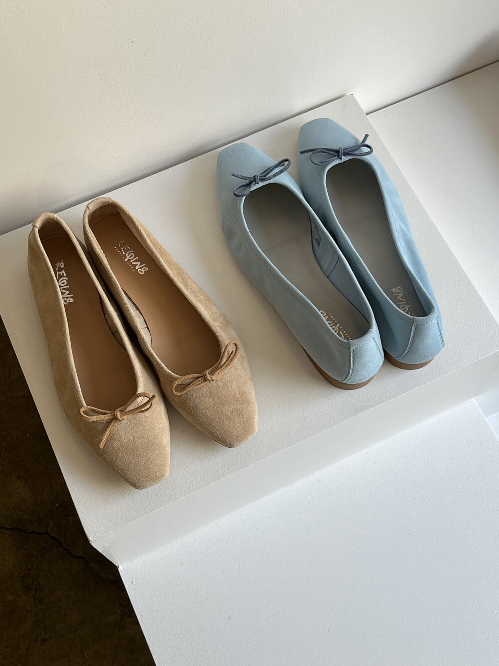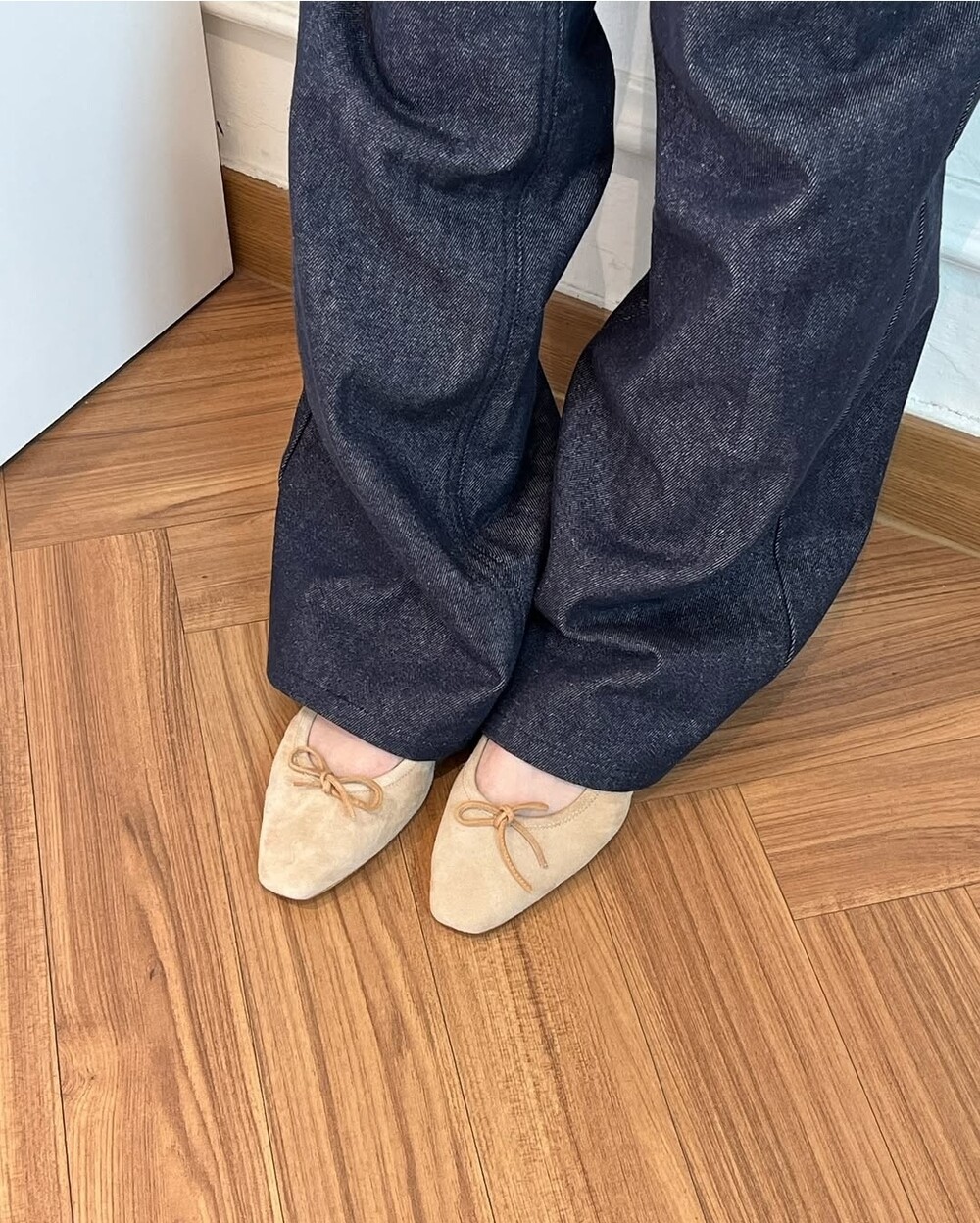 신발 바탕 컬러와 리본 컬러의 채도가 대조되어 그 자체로 포인트가 되는 플랫슈즈입니다.