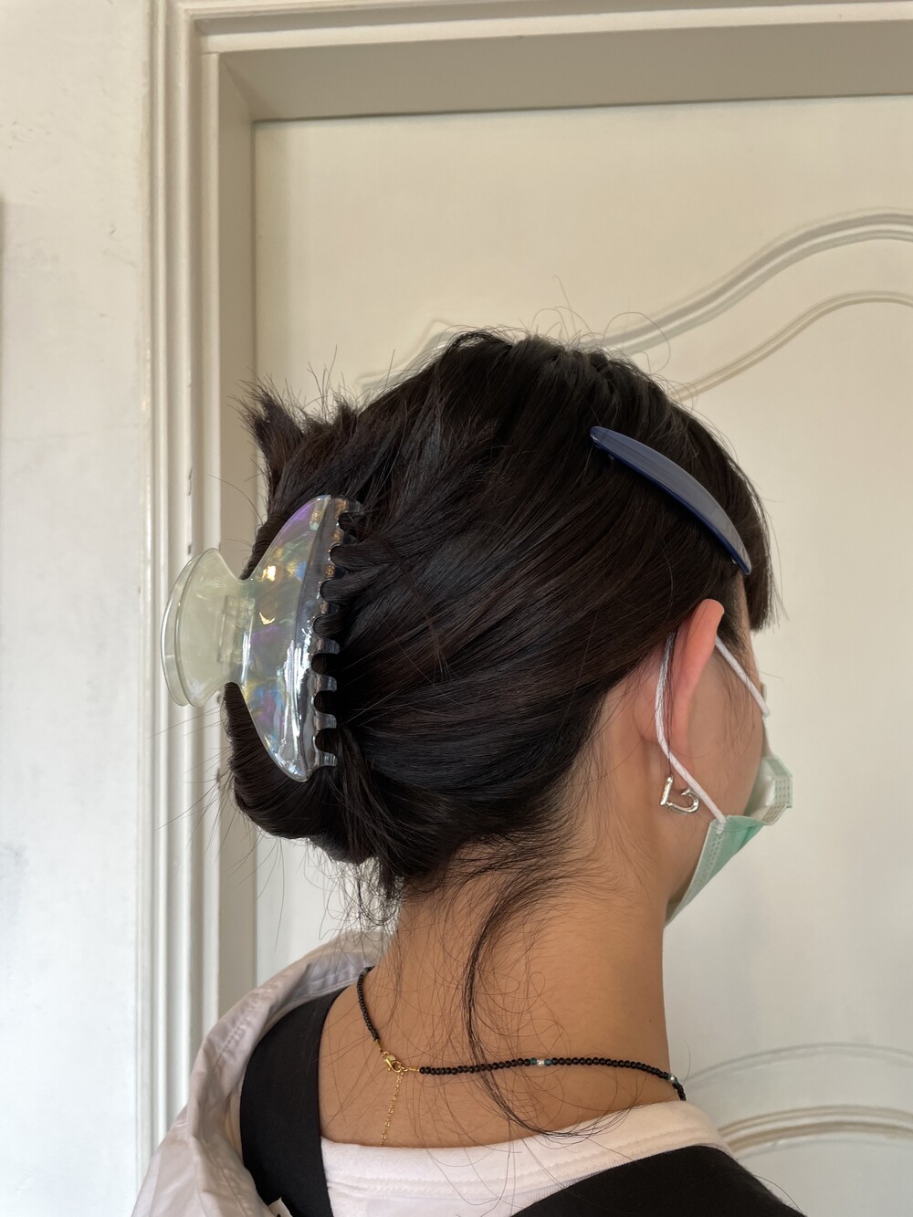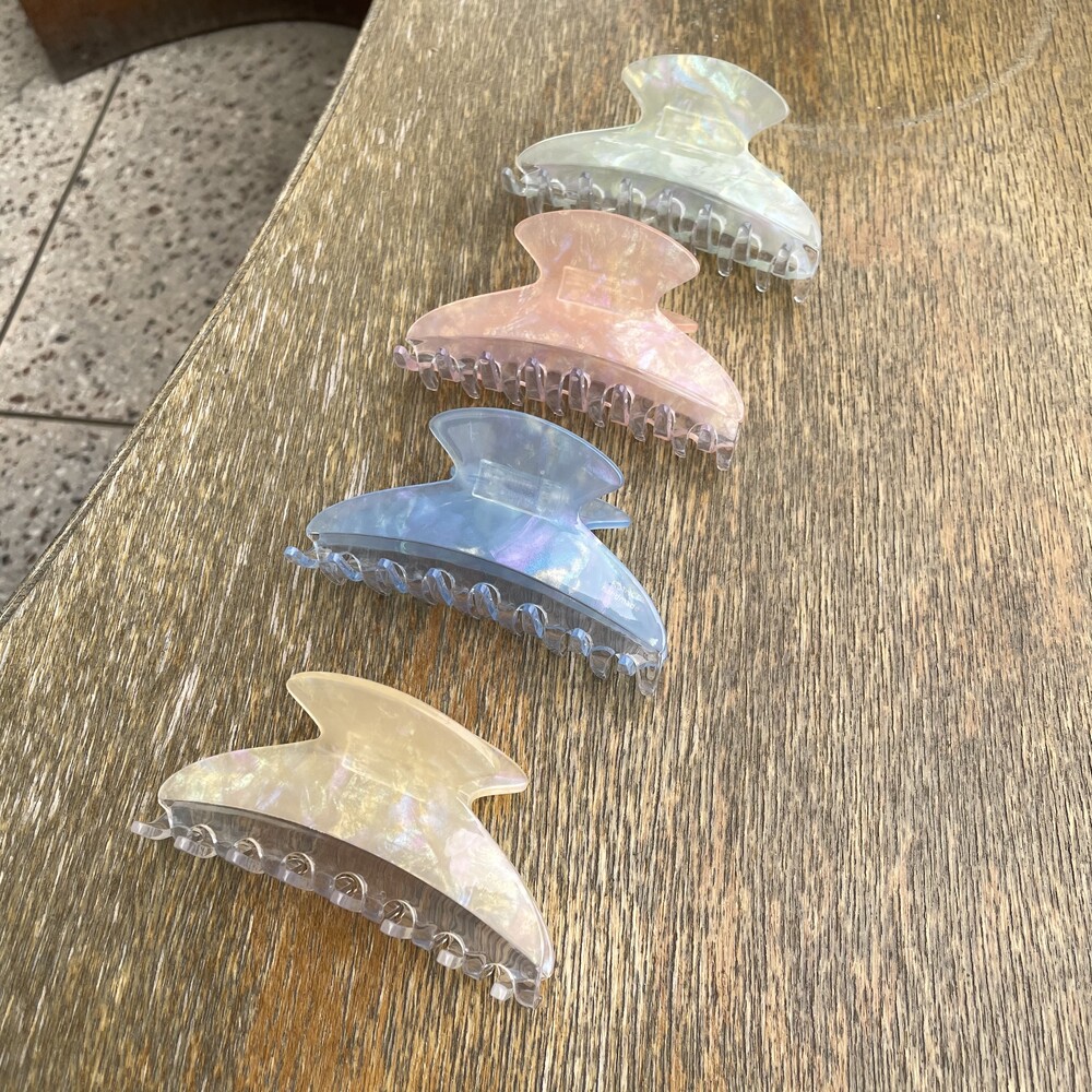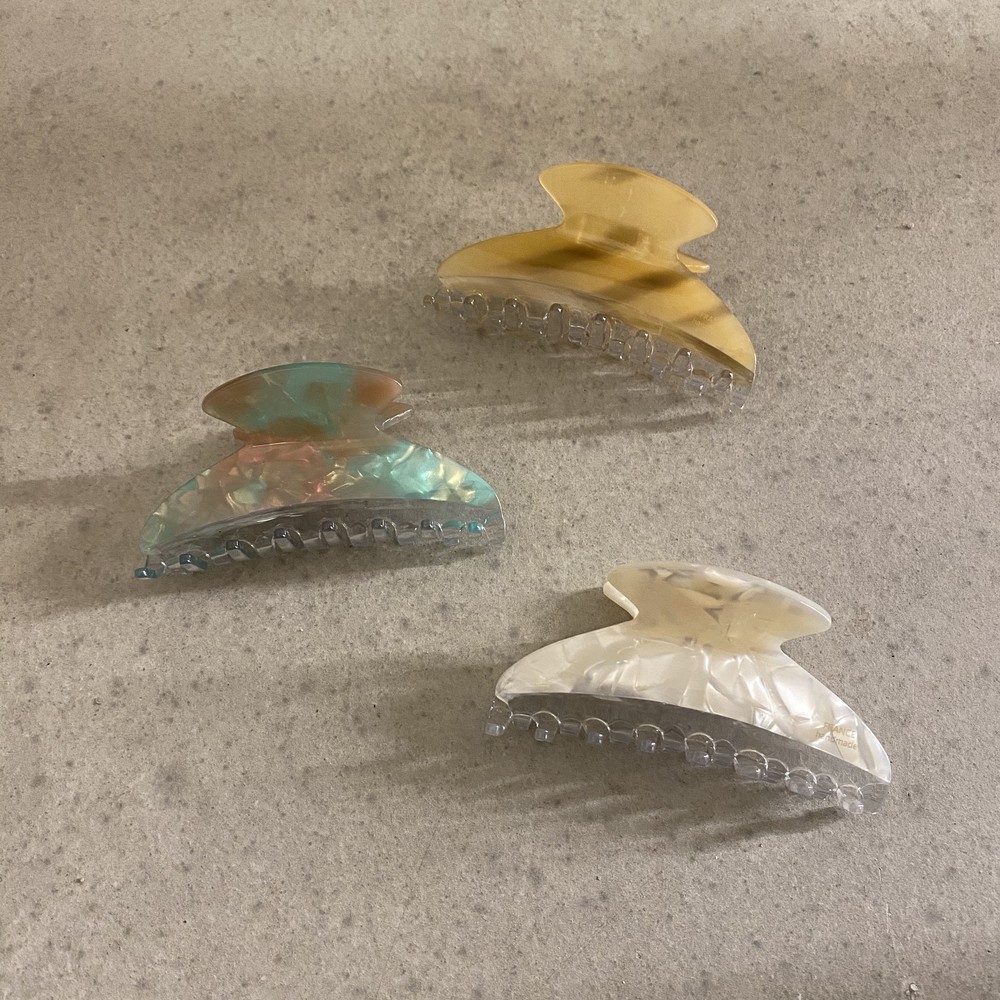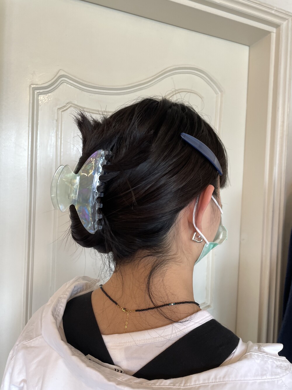 반투명한 재질과 투명 재질이 함께 혼합되어 있으며, 한 가지로 특정지어 부르기 어려운 오묘한 색감이 너무 예쁜 핀입니다. 머리도 굉장히 단단하게 고정을 해주어 편리하게 착용이 가능합니다.