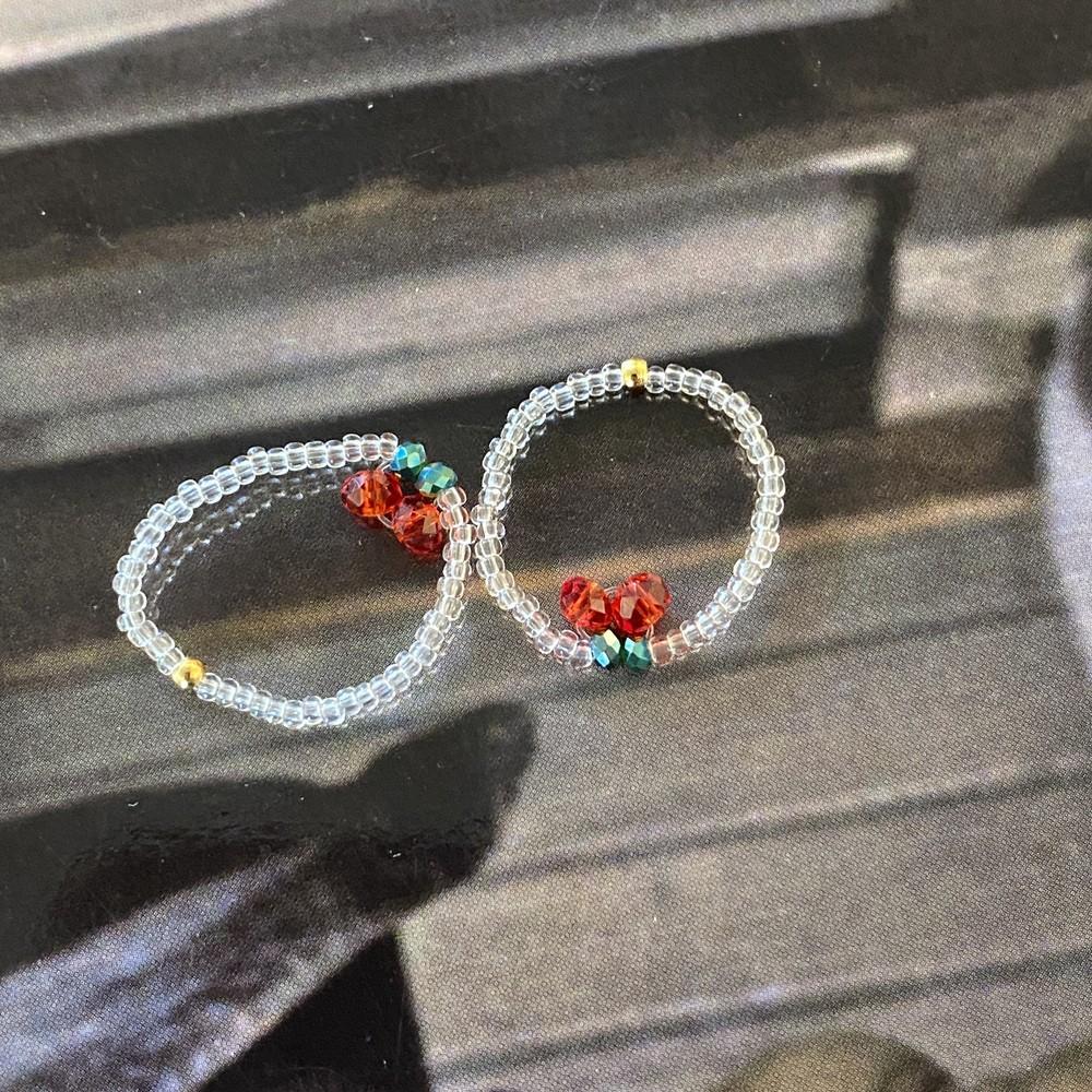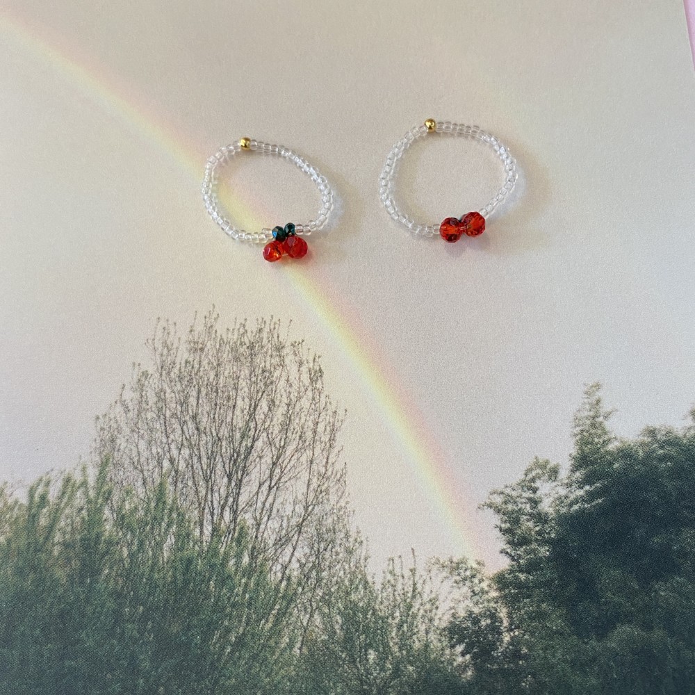 투명한 비즈들이 바탕으로 되어있고 더 굵은 빨간 비즈를 체리처럼 형상화해 제작해 만든 상품입니다.