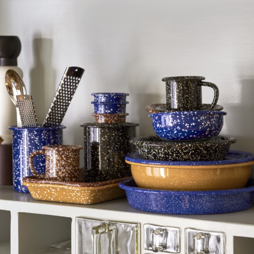가볍고 내구성이 강한 에나멜로 가공된 HAY의 에나멜 컬렉션은 다양한 일상 접시, 접시 및 주방 용기로 구성되어 있습니다. 독특한 얼룩무늬에 어두운 바탕컬러의 디자인이 특징인 이 제품은 색상, 모양 및 크기가 매우 다양합니다. 핸드메이드 기법으로 페인트의 흩뿌려지는 느낌이 제품마다 다를 수 있습니다.