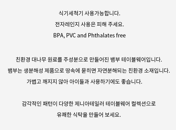 소개해드리는 제니아테일러의 플레이트는 산업 제조업체의 공정 작업에서 버려진 대나무를 재활용하여 만들어진 상품입니다. 제니아 테일러의 모든 식기 제품들은 PVC, BPA 및 모든 환경호르몬, 프탈레이트 등이 검출되지 않습니다.