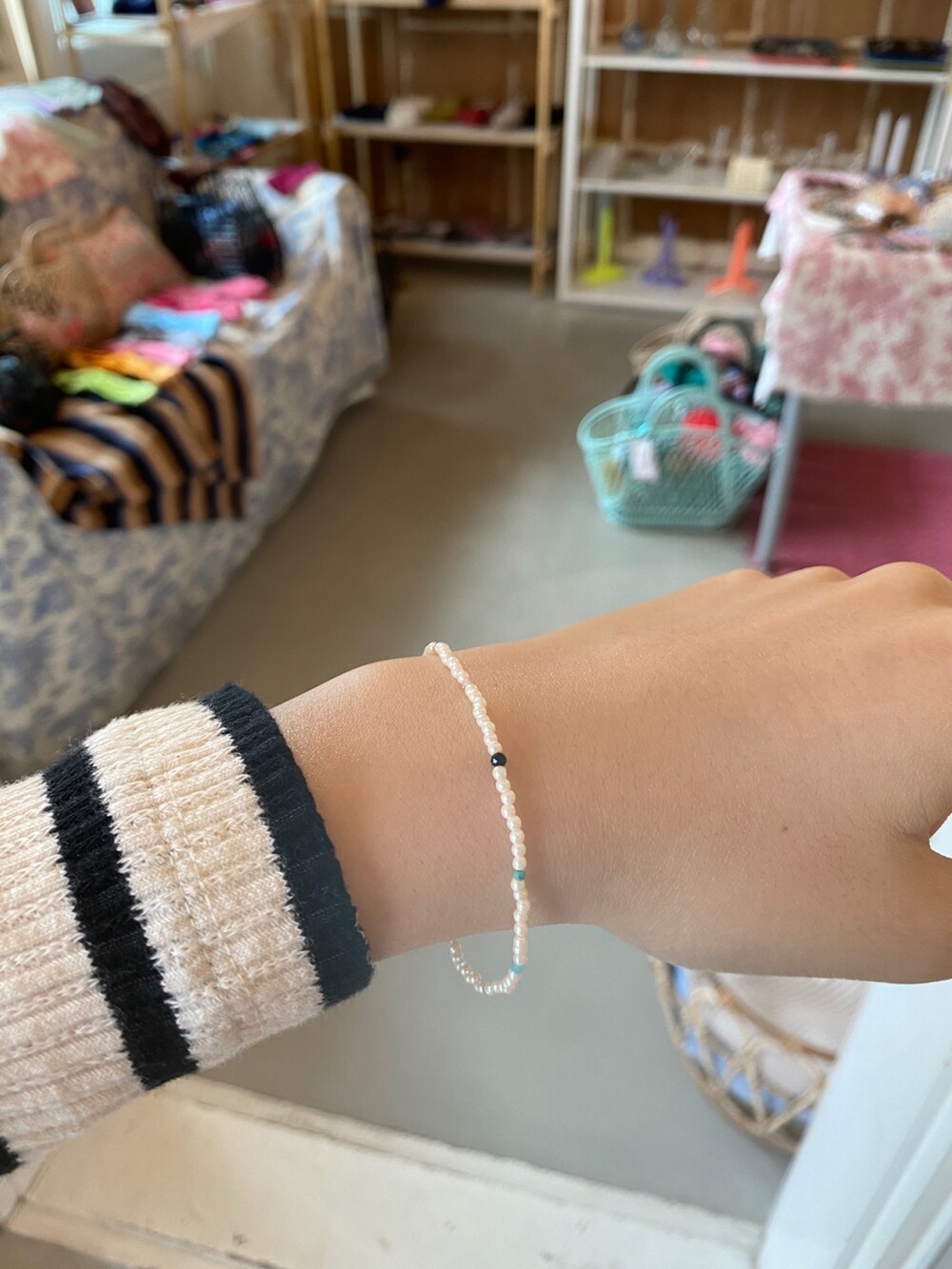 색을 함께지닌 Pearl Bracelet을 소개해 드려요. 여름철에는 기본 티셔츠에 하나만 착용해 주셔도 멋스러울거예요.