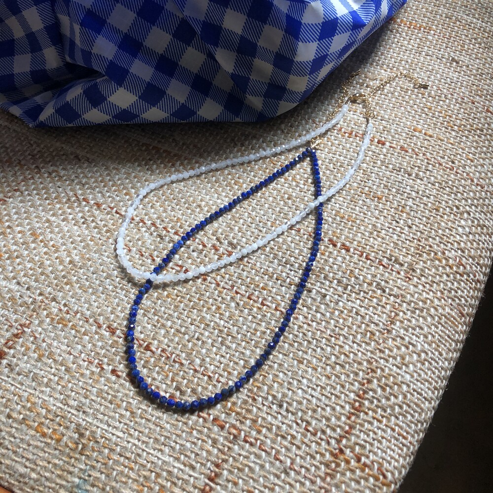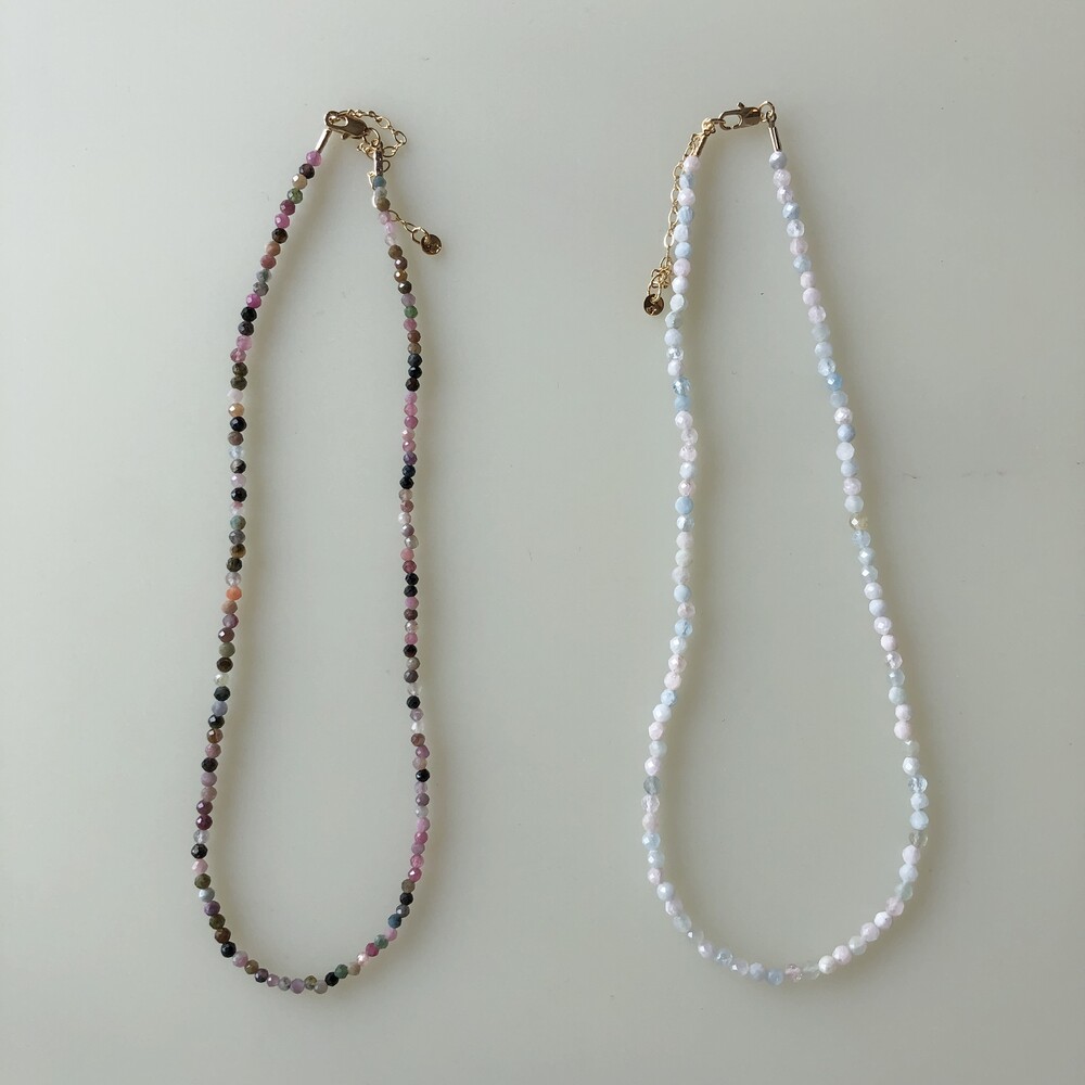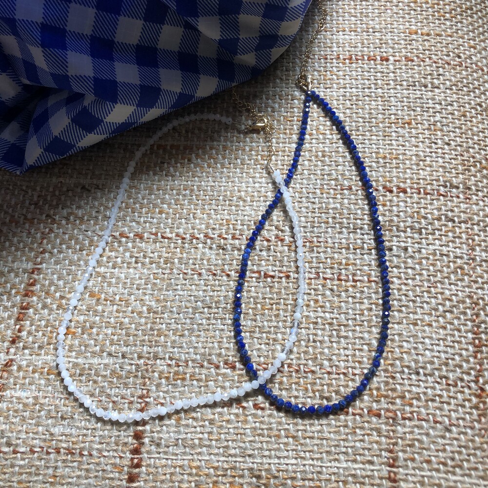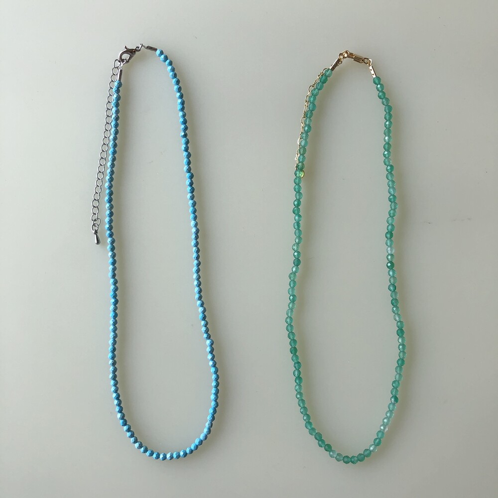 청량한 느낌의 화이트 잼스톤과 블루톤에 은은한 펄이 겉도는 젬스톤 목걸이들 입니다.