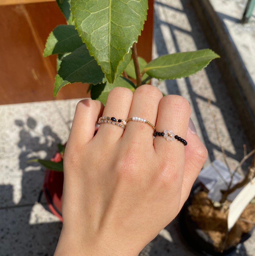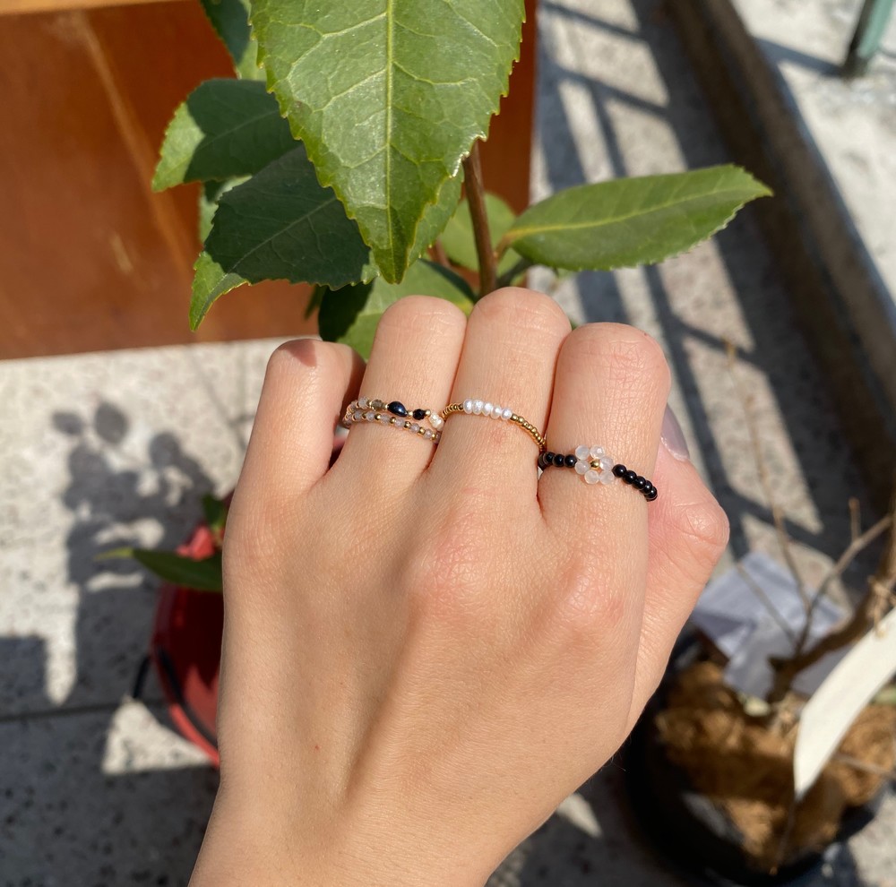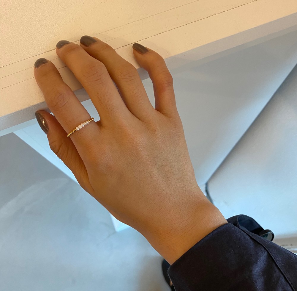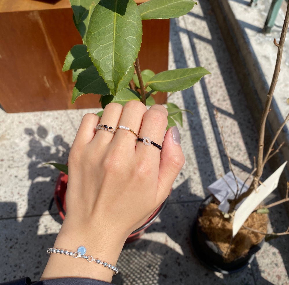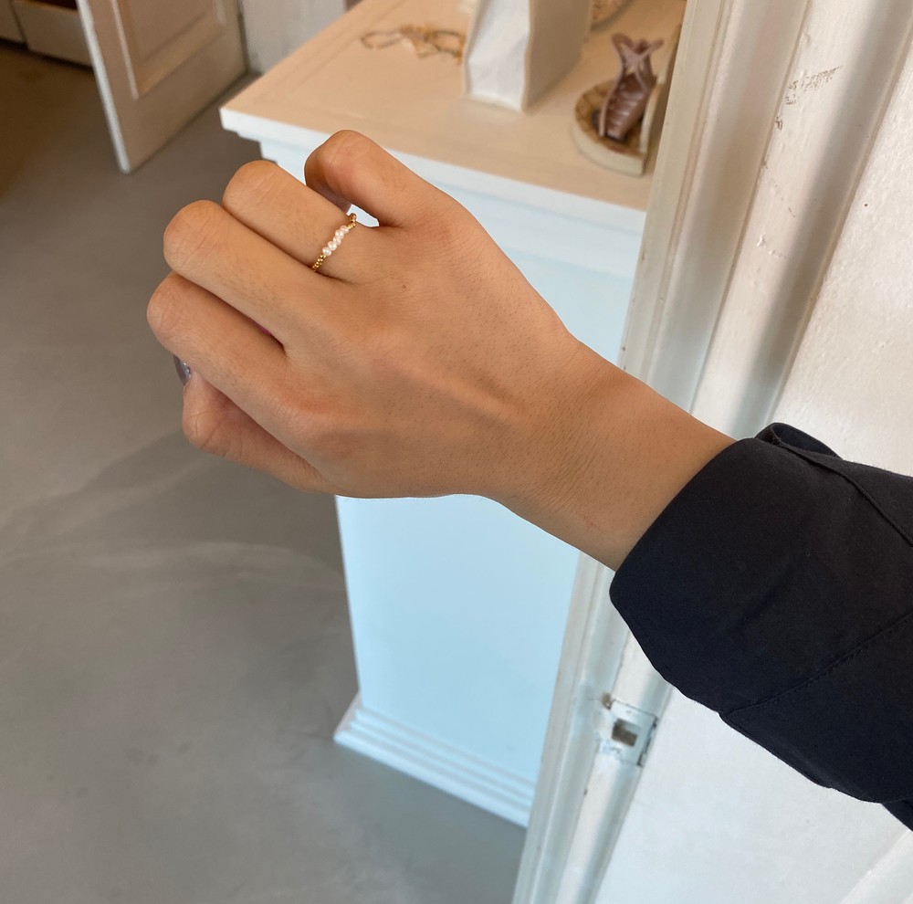 얇은 금색 알알이들 사이에 가운데만 진주로 되어있어서 은은하고 소소하니 편안한 느낌을 주는 반지에요. 기존에 자기주장 강한 반지들과 레이어드하기엔 딱 이랍니다 :)