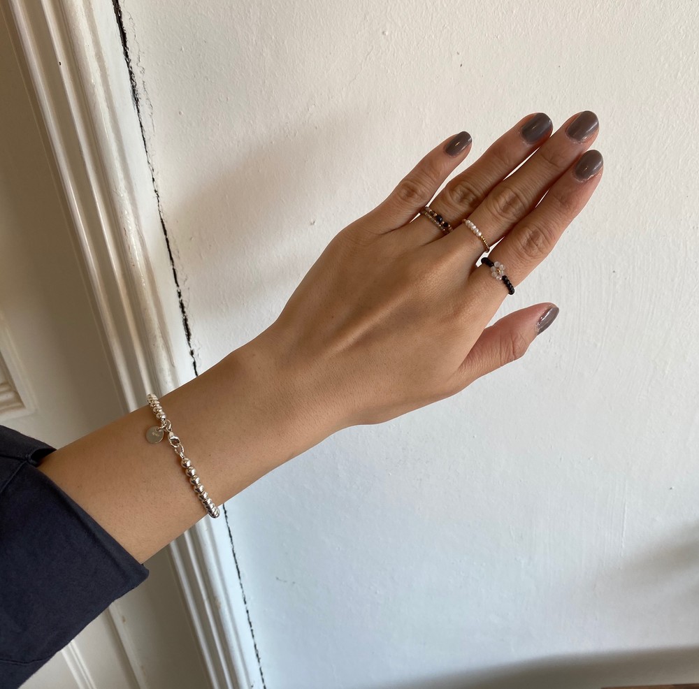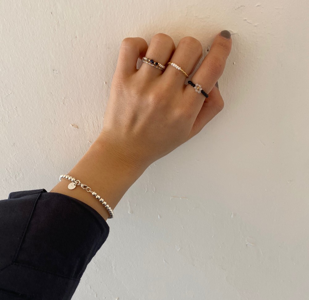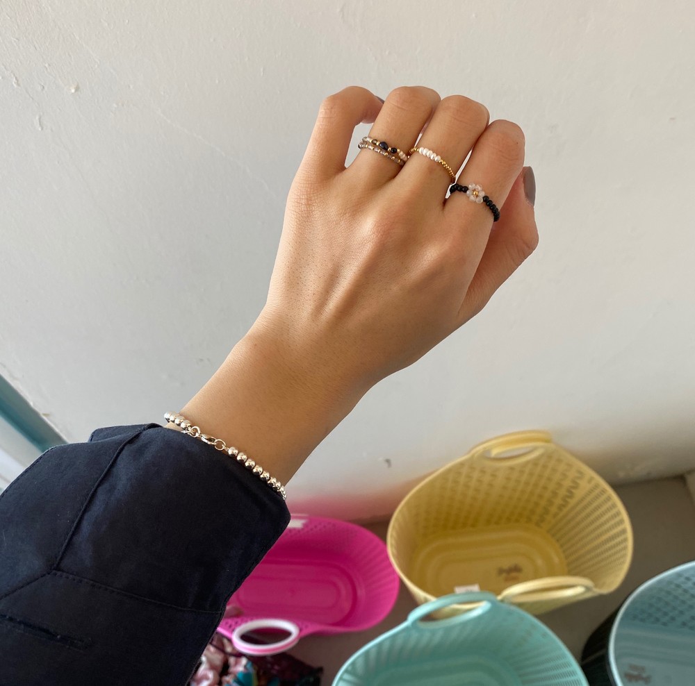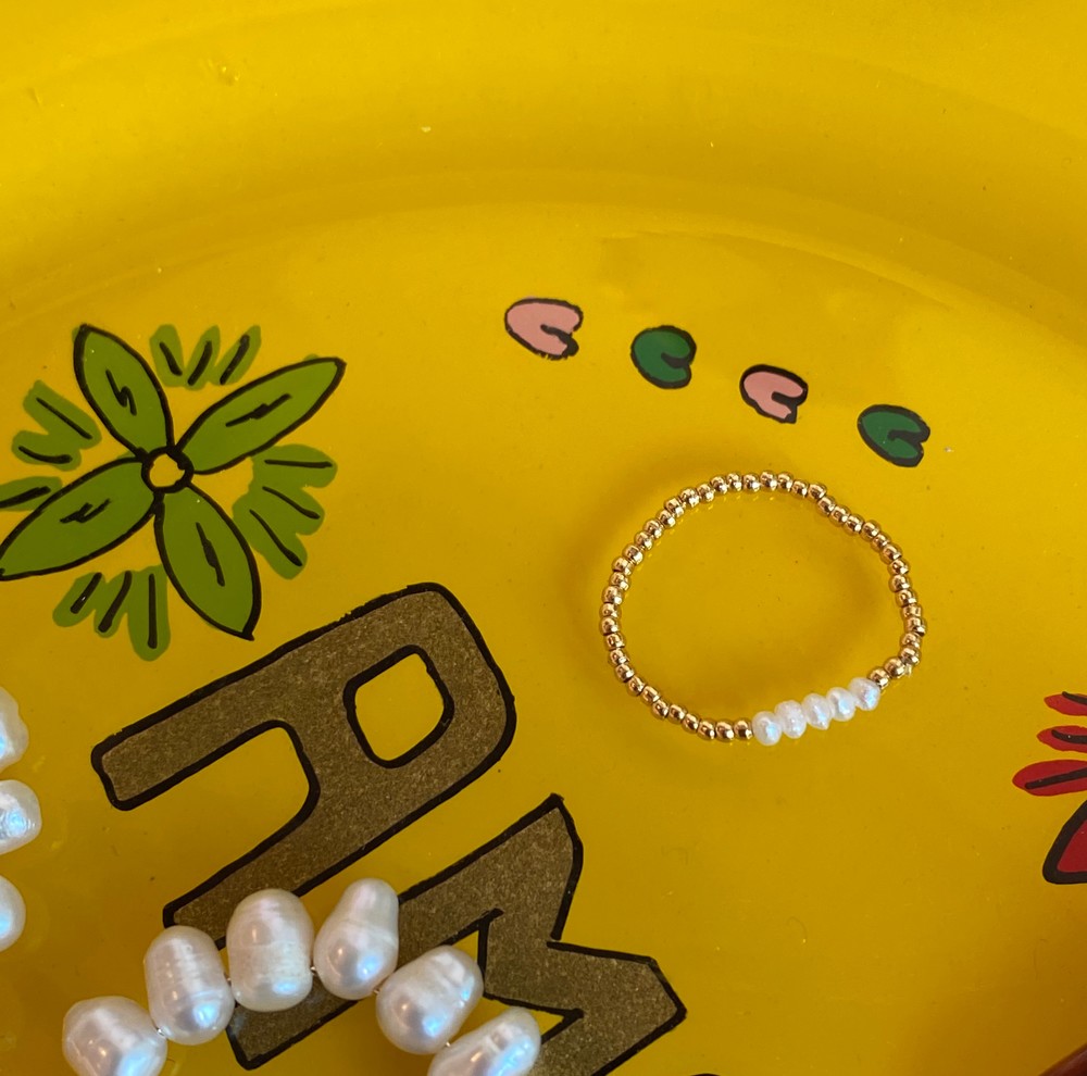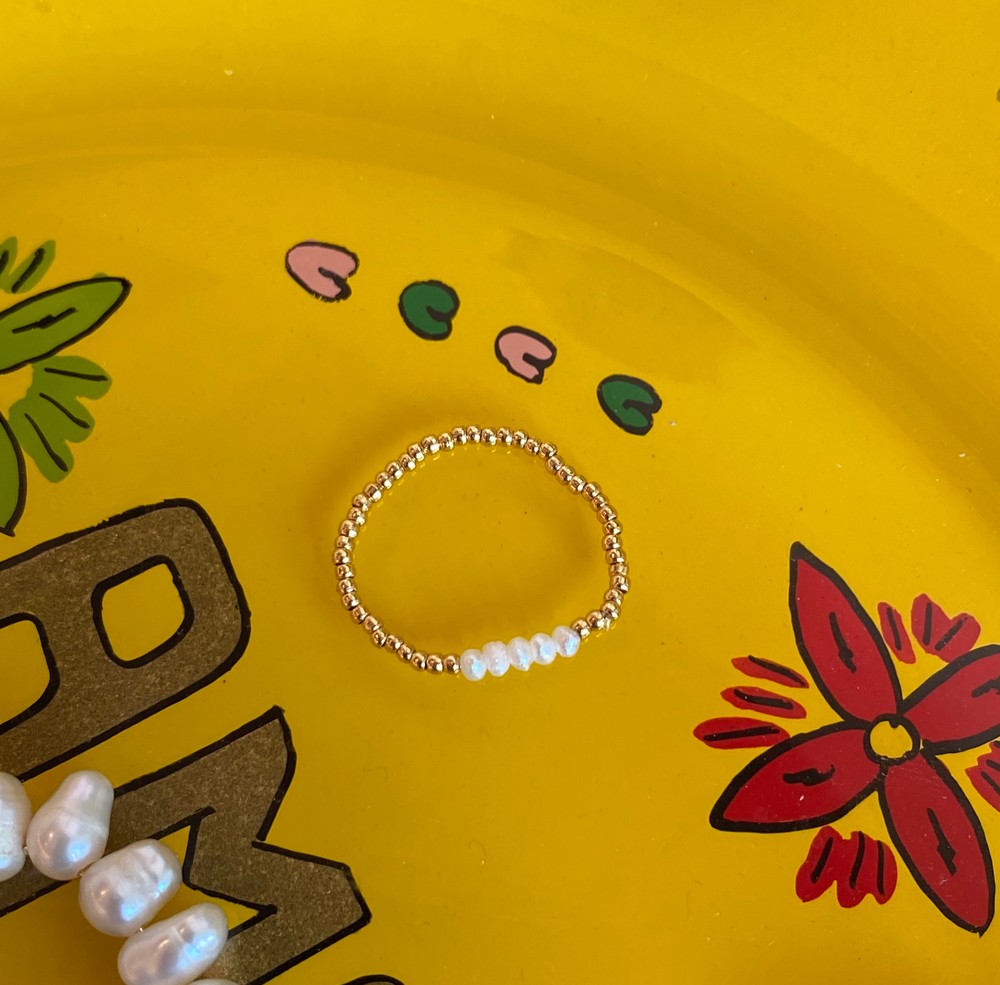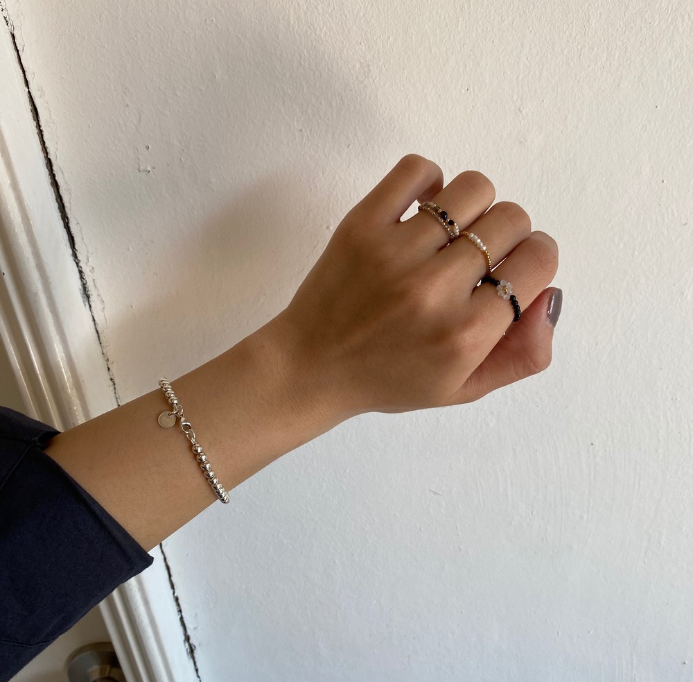 얇은 금색 알알이들 사이에 가운데만 진주로 되어있어서 은은하고 소소하니 편안한 느낌을 주는 반지에요. 기존에 자기주장 강한 반지들과 레이어드하기엔 딱 이랍니다 :)